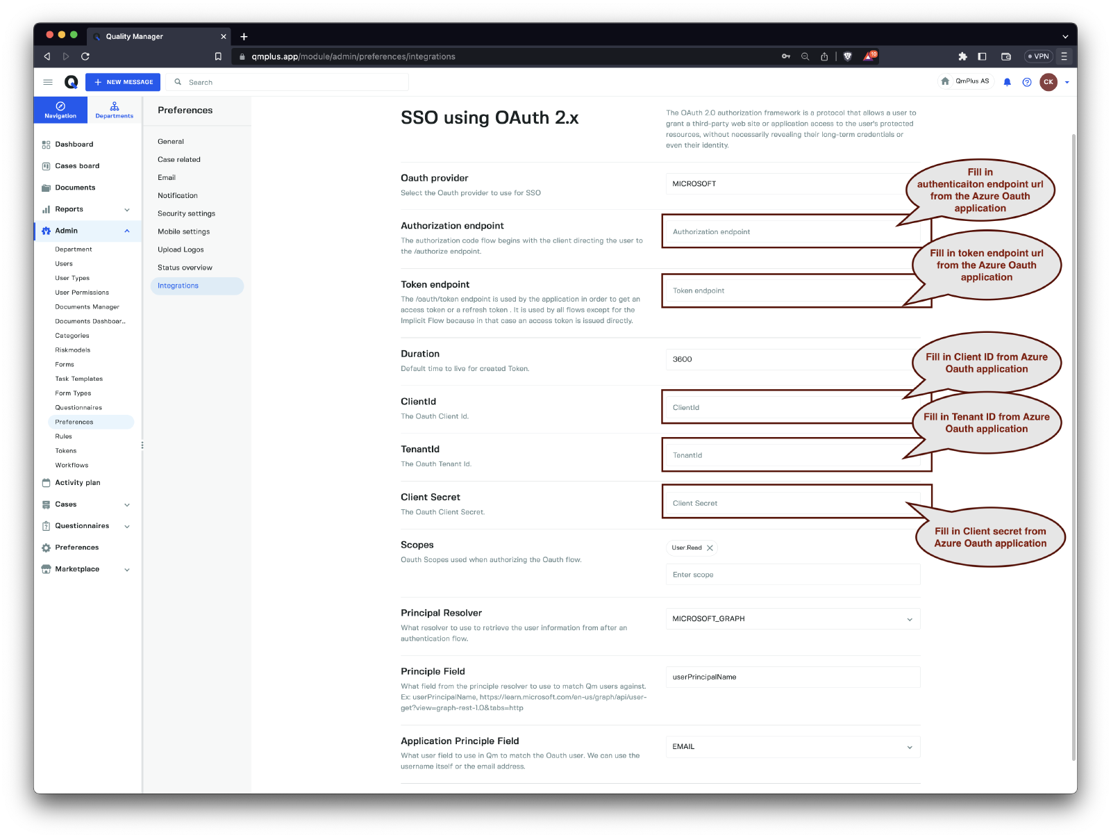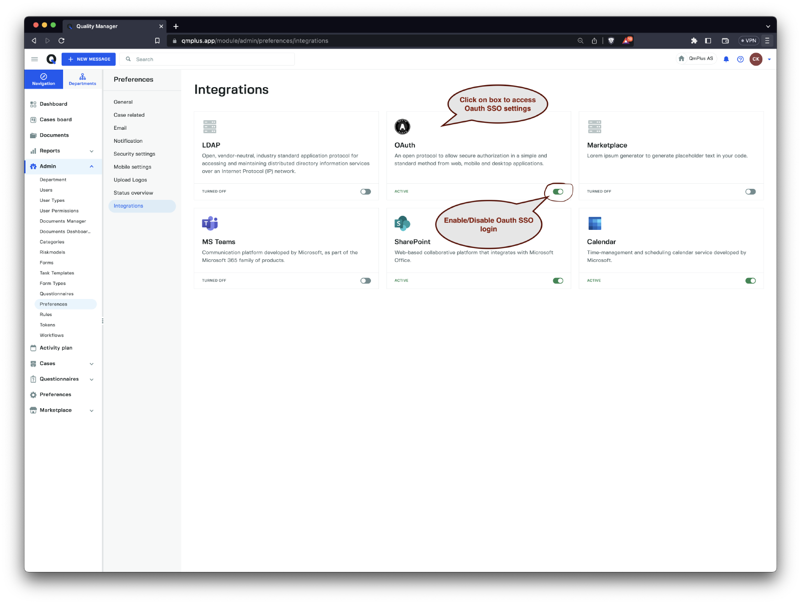 OAuth SSO must be enabled for your account before you can proceed with the setup. Please contact sales at post at qmplus.com to get in touch about cost and availability for your plan.