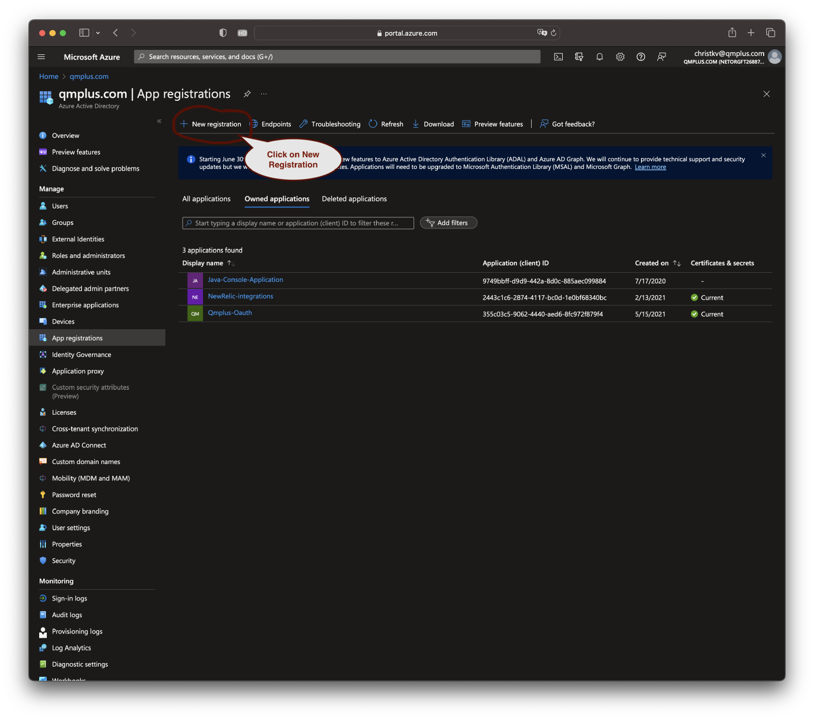 In the Azure Active Directory dashboard, look for the “App registrations” link in the Manage section and click on it. Then, click on the “New registration” button at the top of the page.