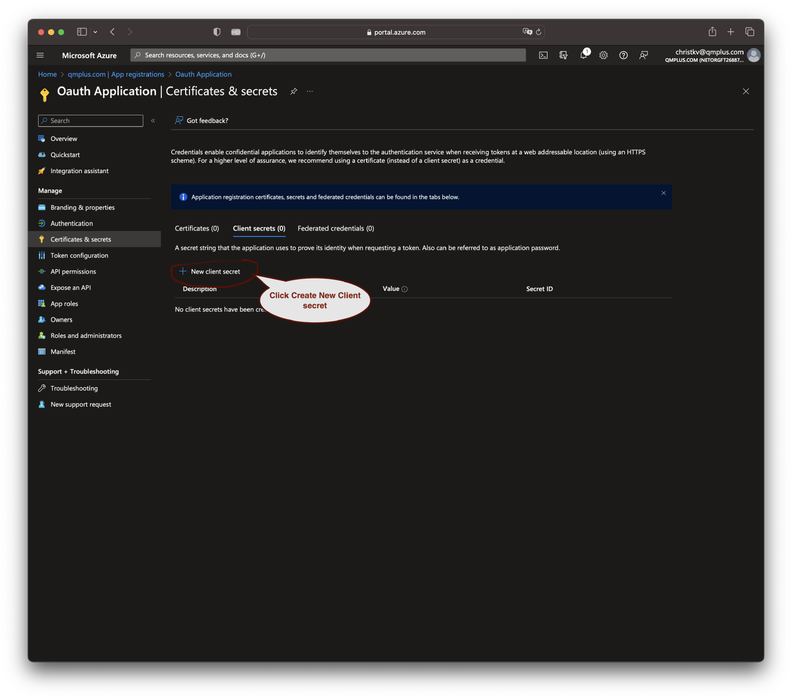 In the left-hand menu of your application dashboard, look for the “Certificates & secrets” link and click on it. Then, click on the “New client secret” button.
