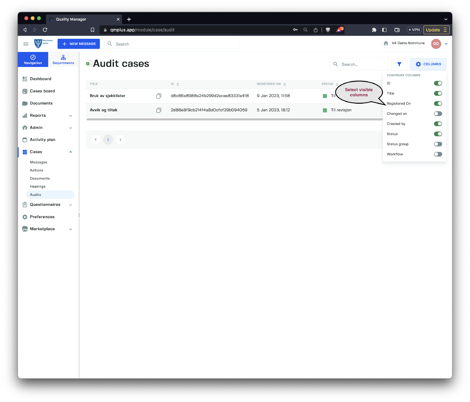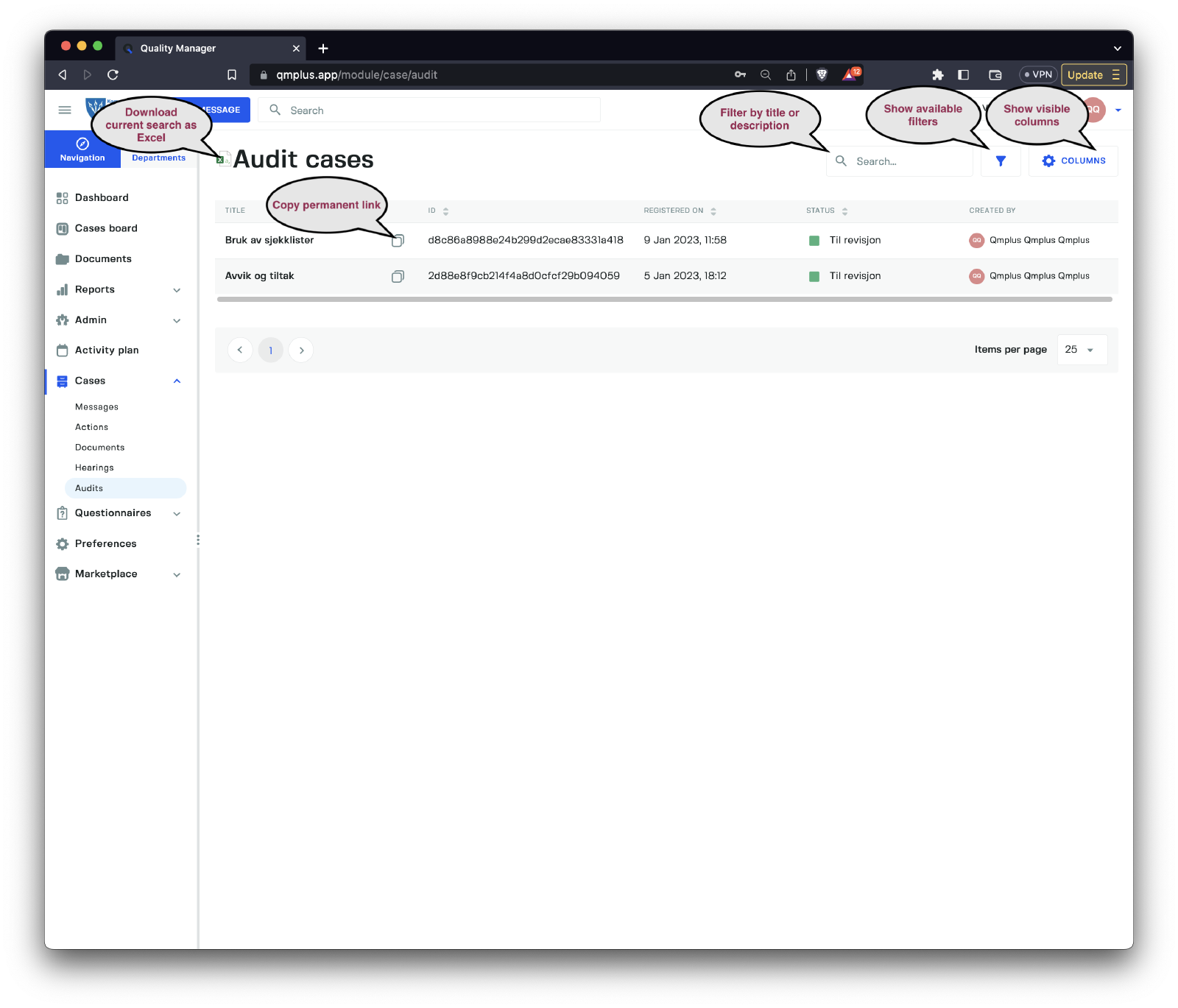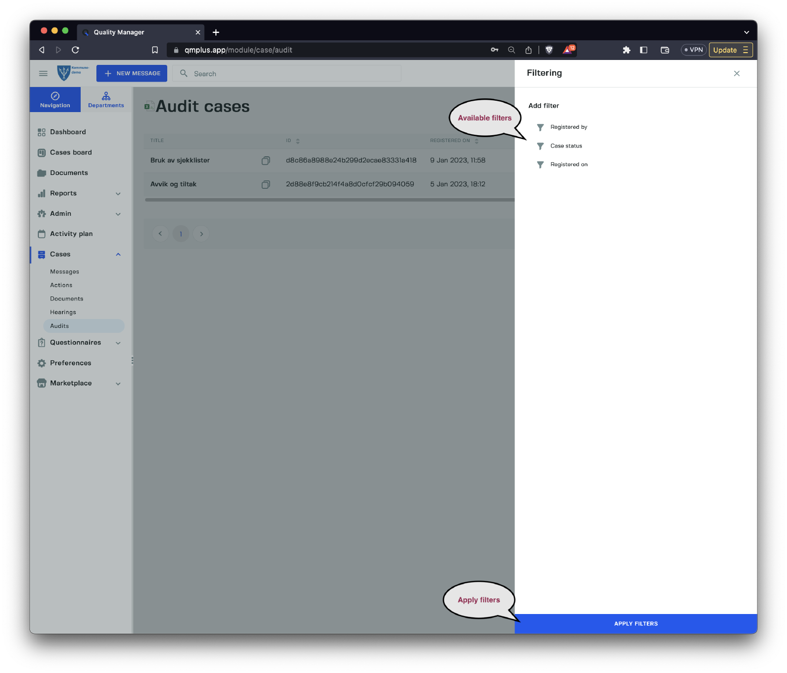 The audits list displays an overview of all audit cases in the system. Users can apply filters to quickly locate specific audit cases or groups of related cases.