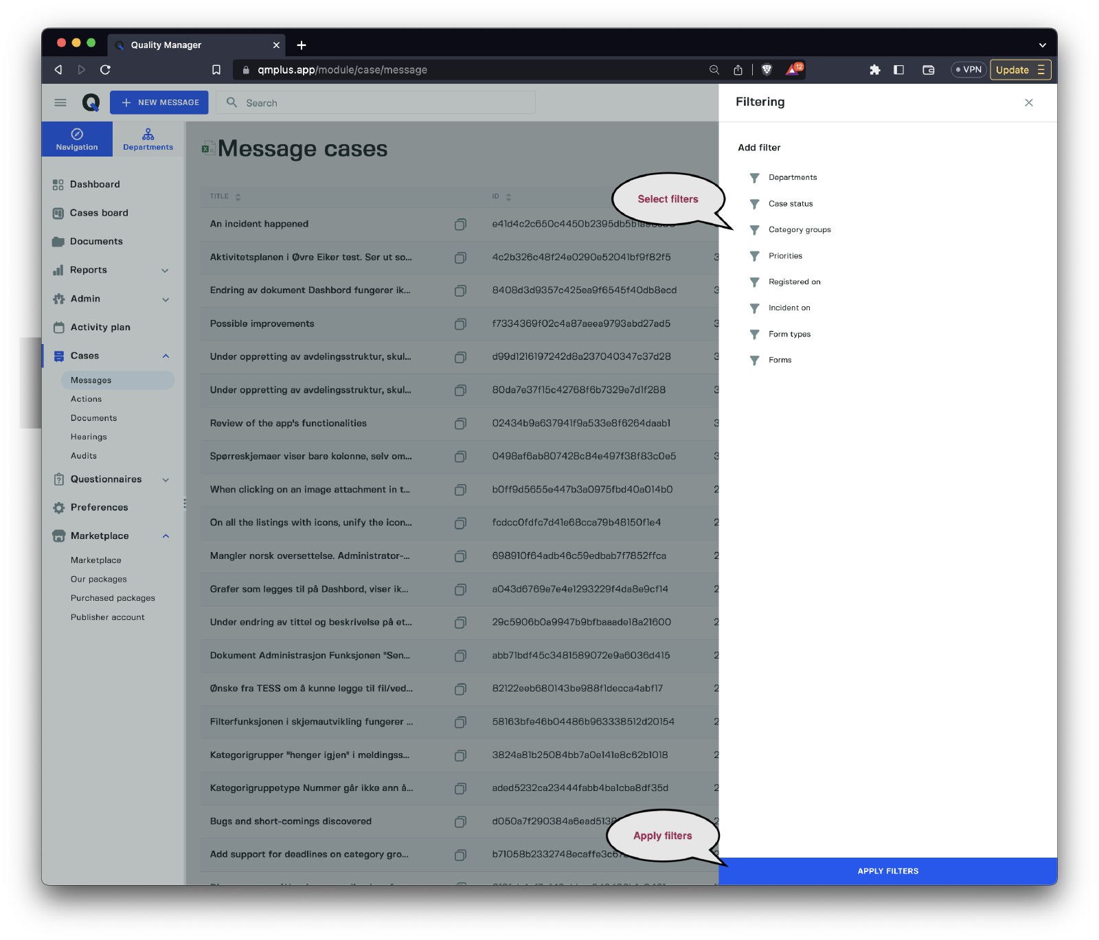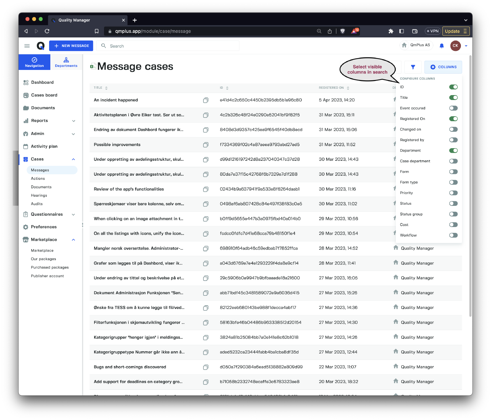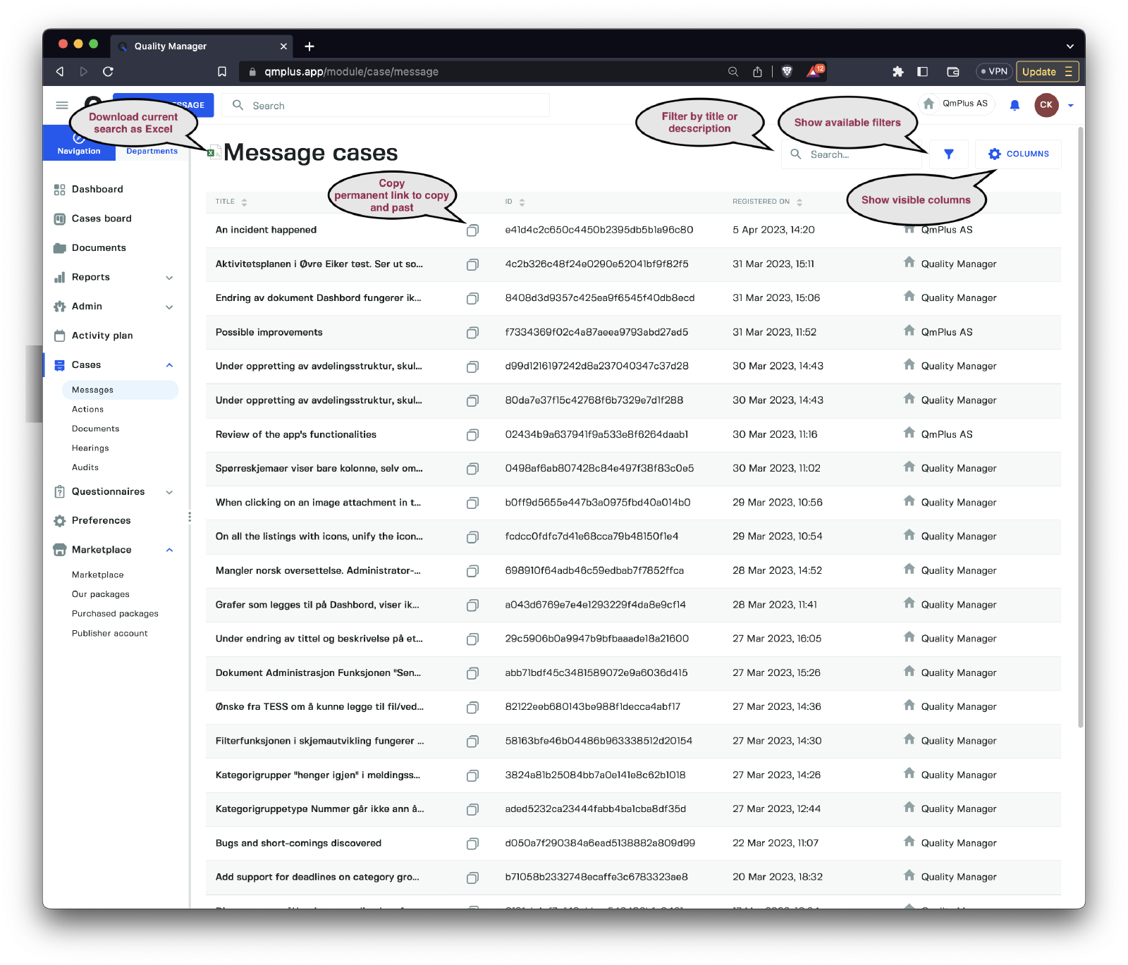 The messages view provides a comprehensive and convenient way to manage message cases by enabling you to quickly locate specific message cases or a group of related message cases. You can search by title and description, apply specific filters, and customize the visible columns. An Excel export function allows you to extract the cases into an Excel sheet effortlessly.