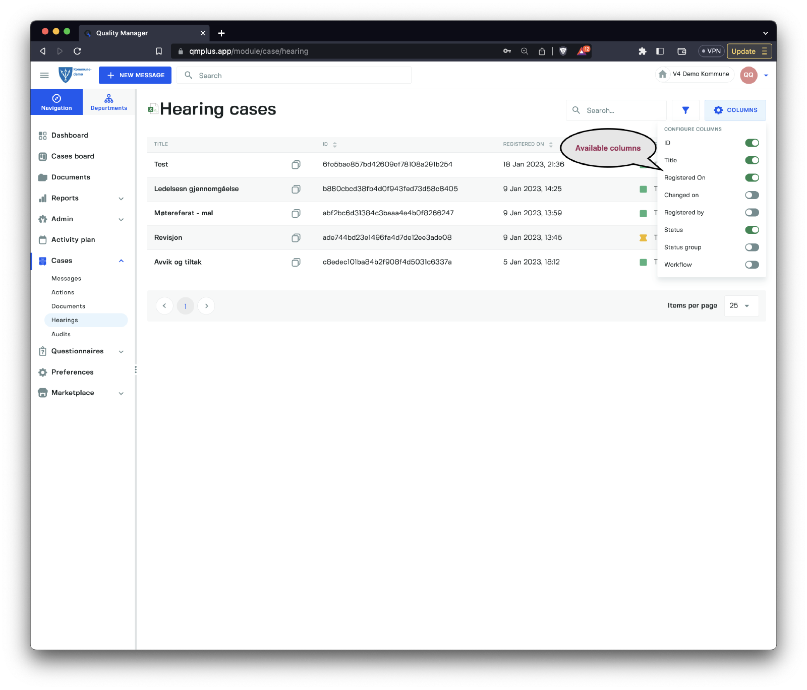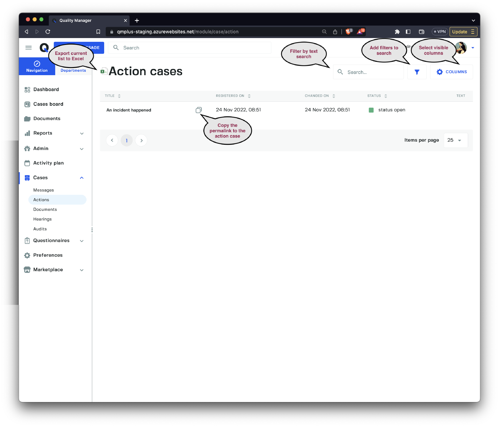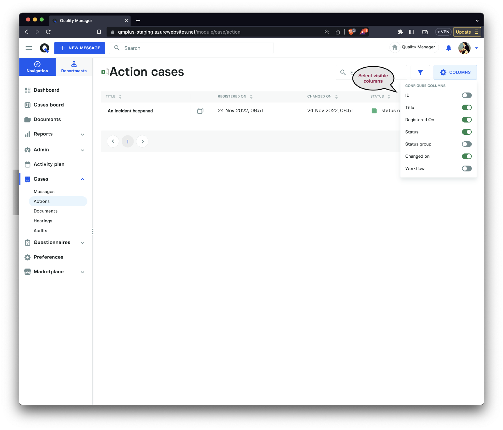 The messages view provides a comprehensive and convenient way to manage message cases by enabling you to quickly locate specific message cases or a group of related message cases. You can search by title and description, apply specific filters, and customize the visible columns. An Excel export function allows you to extract the cases into an Excel sheet effortlessly.