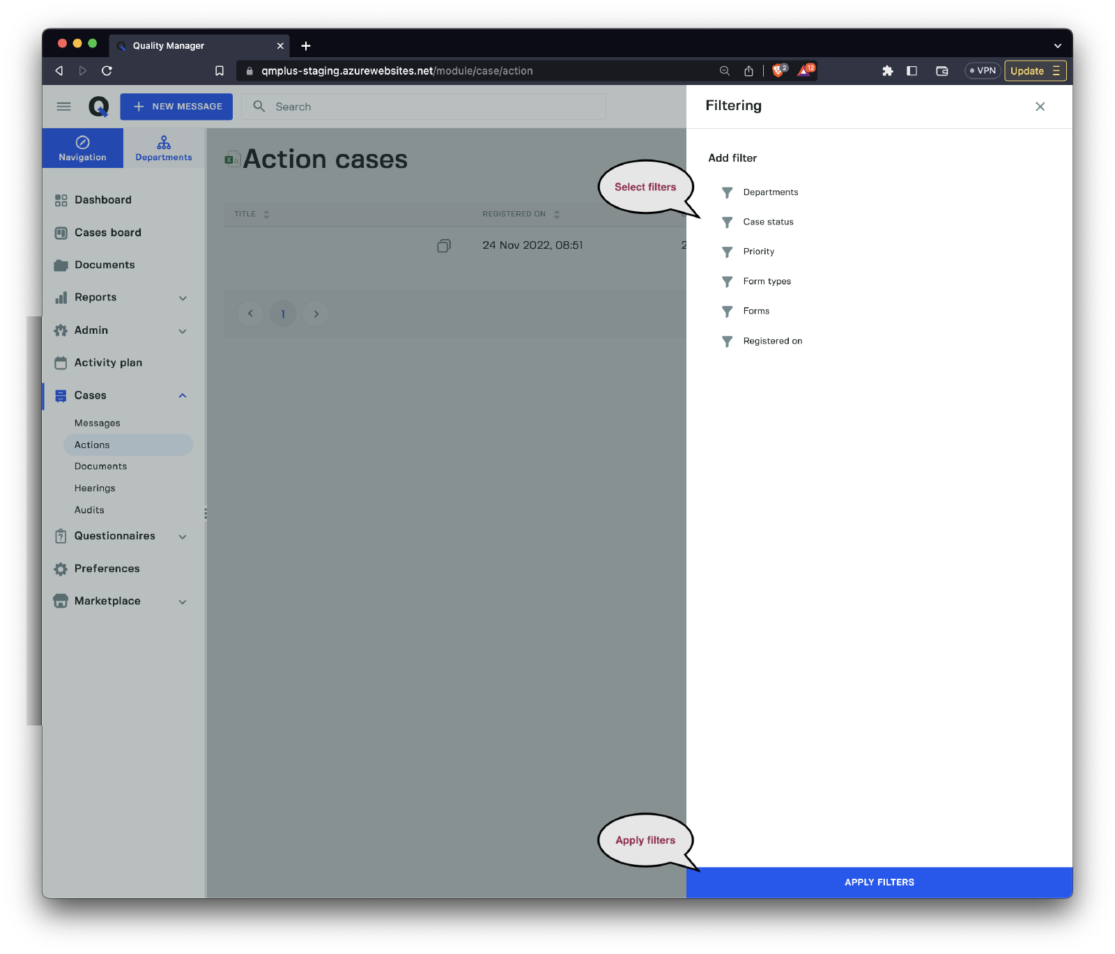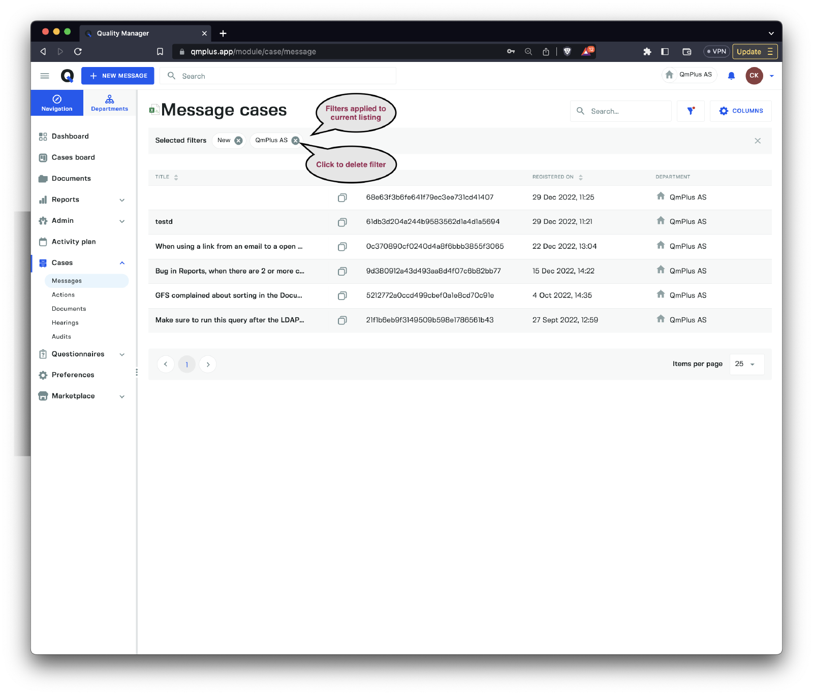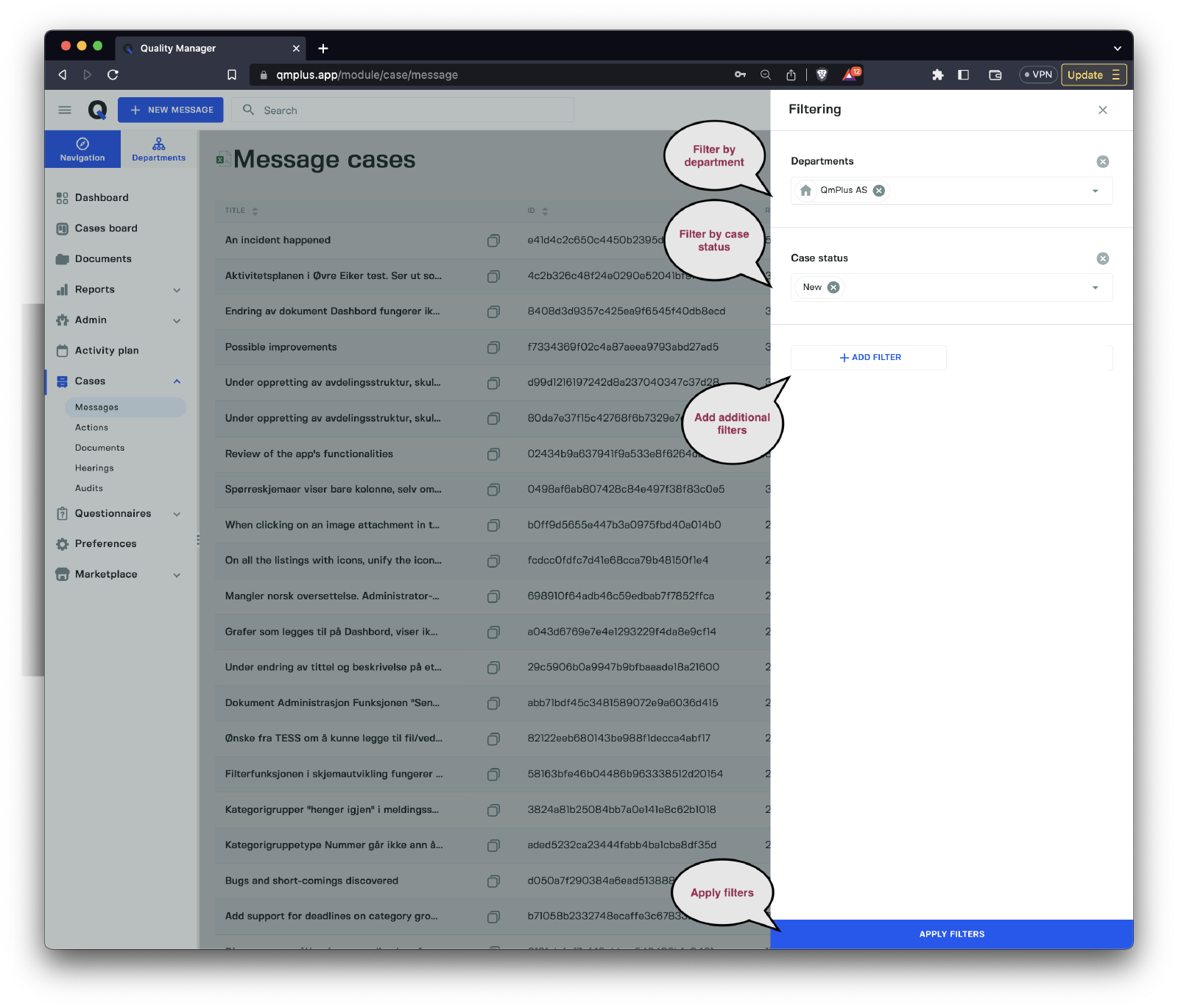 The image above illustrates the application of two filters: cases for the department QmPlus AS and cases with a status of New. To add more filters, click the Add Filter button. Once you’ve selected your filters, click the Apply Filters button to return to the case list with all filters applied.