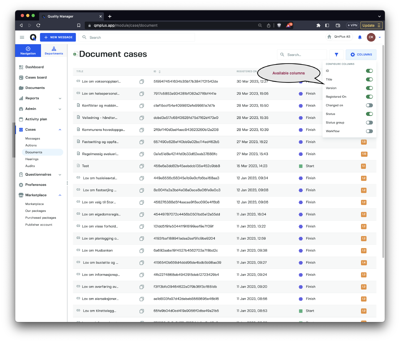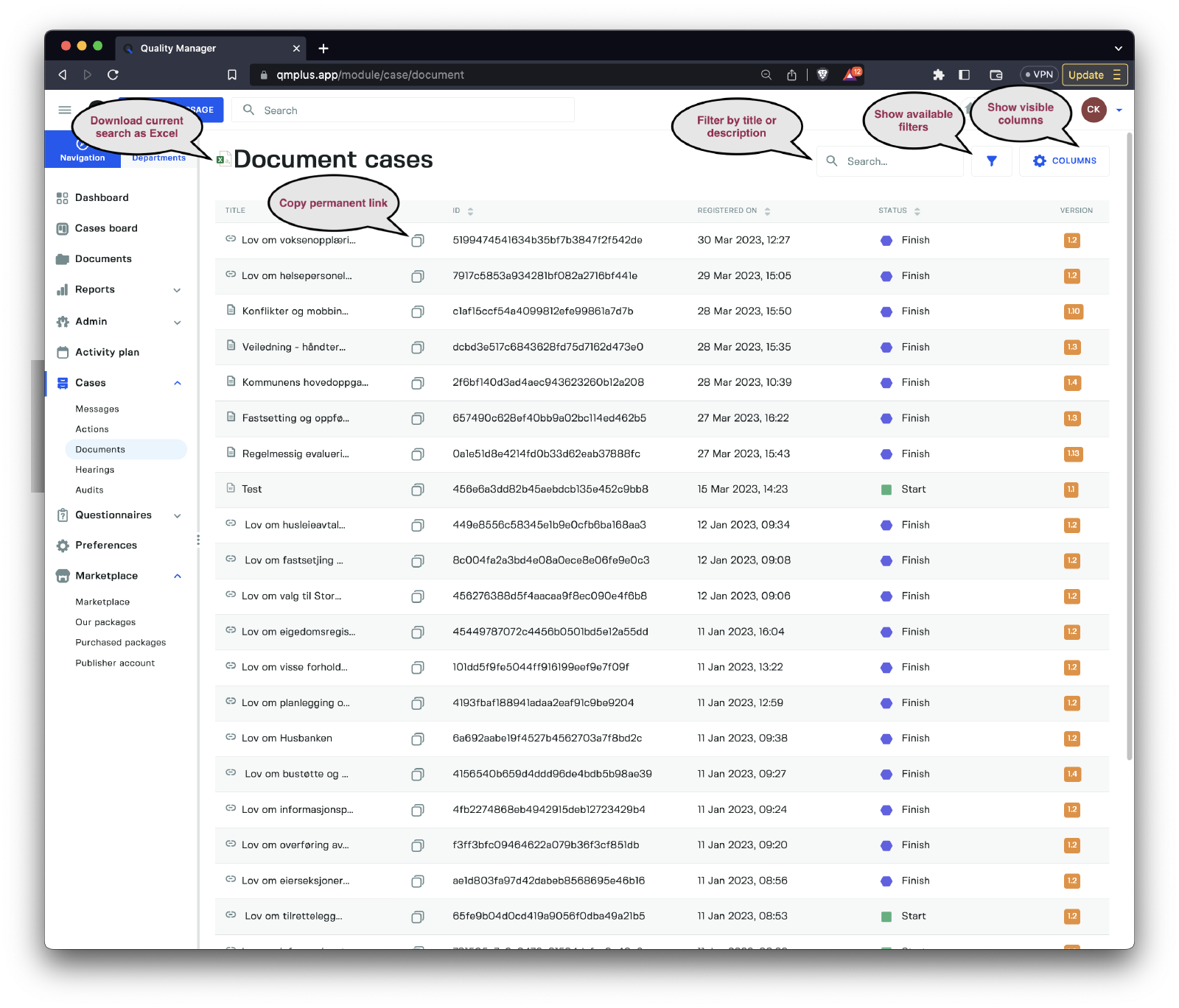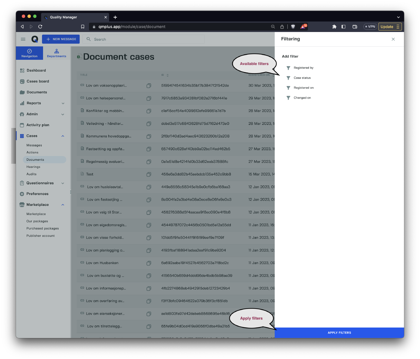 The documents list displays an overview of all documents within the system. Users can apply filters to easily find specific documents or a group of related document cases.