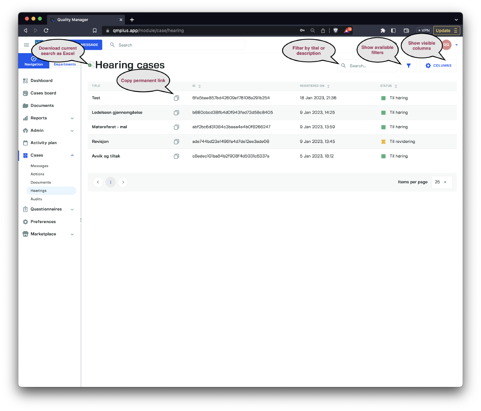 The hearings list provides an overview of all hearings within the system. Users can apply filters to quickly locate specific hearings or a group of related hearing cases.