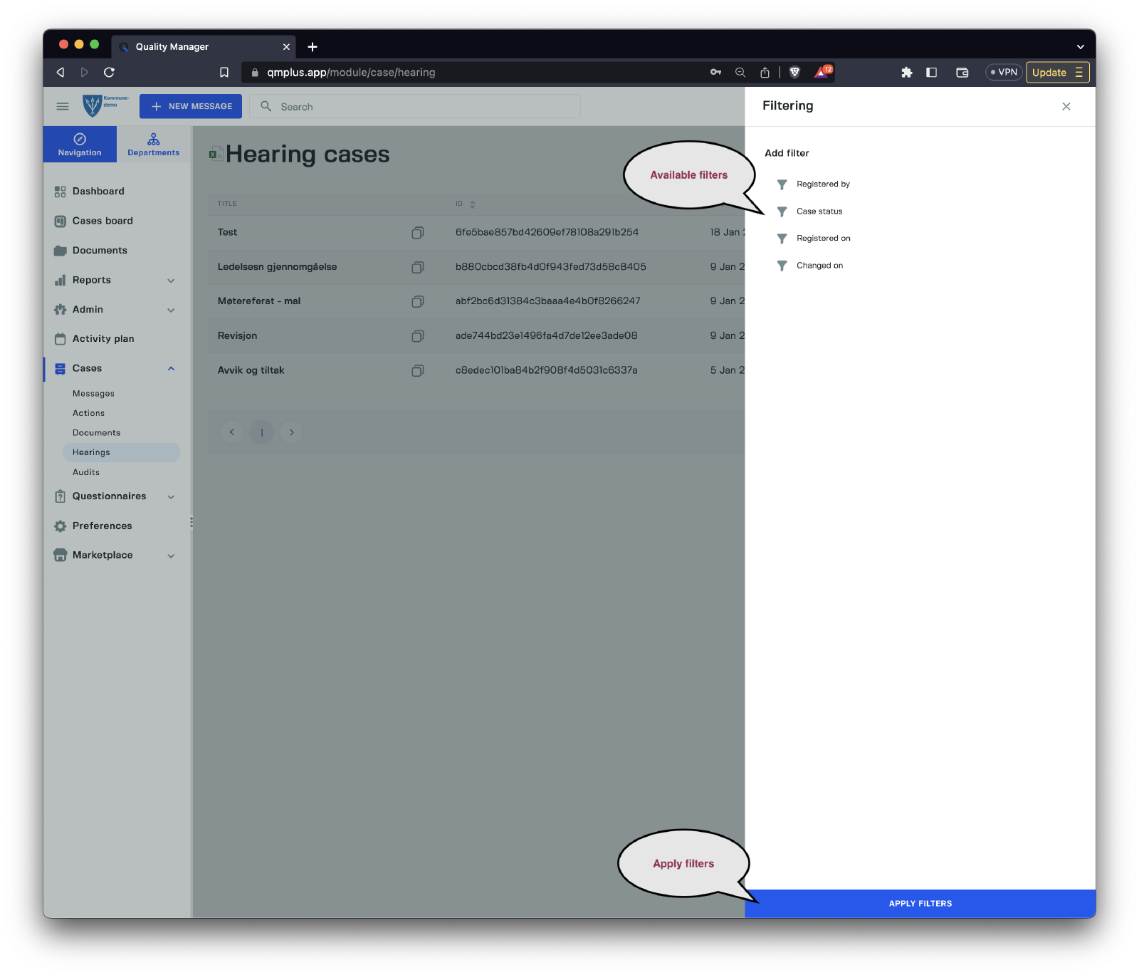 Users can apply filters to refine the list of hearing cases, making it easier to find specific cases or groups of related cases: