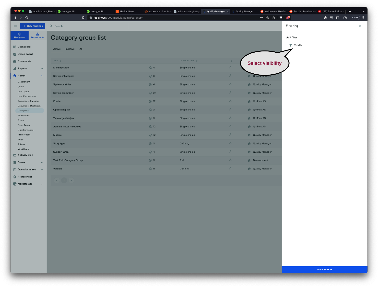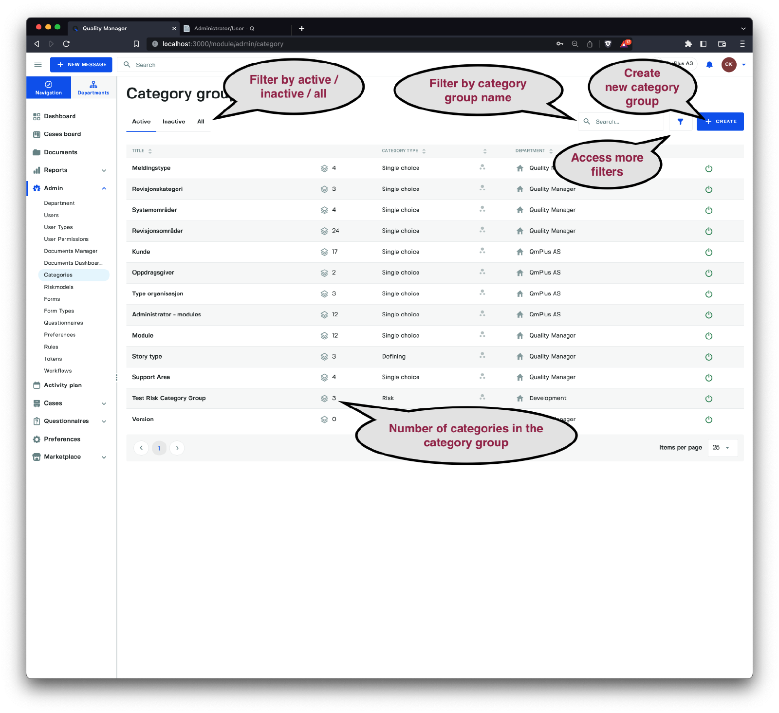 The category group list view allows you to see all the category groups in the system and filter them by several parameters, including the category group’s name and visibility.