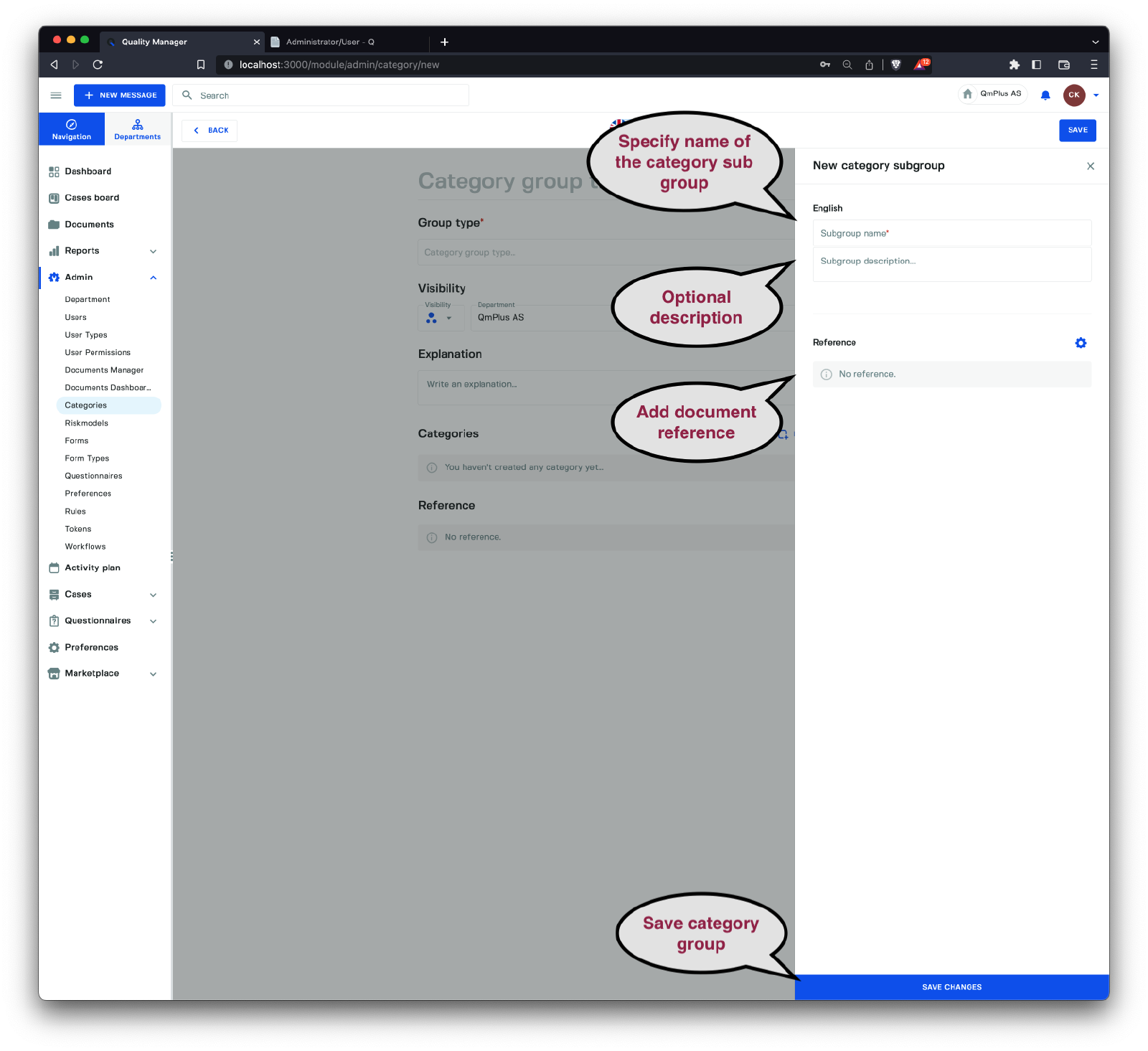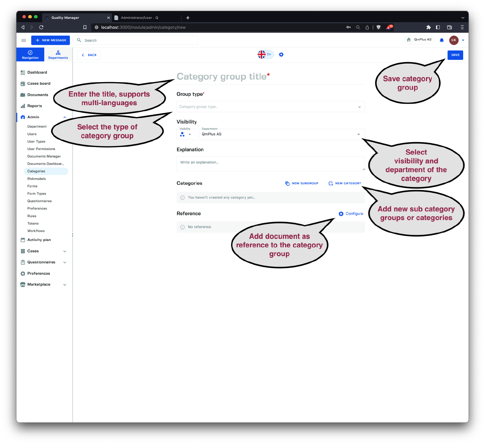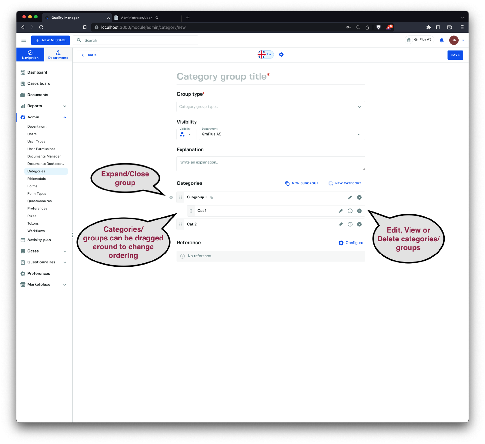 Reference | Allows you to specify a document reference to display with the category group in forms, for example, linking to a relevant law. This can also be done for sub-category groups and categories added. |