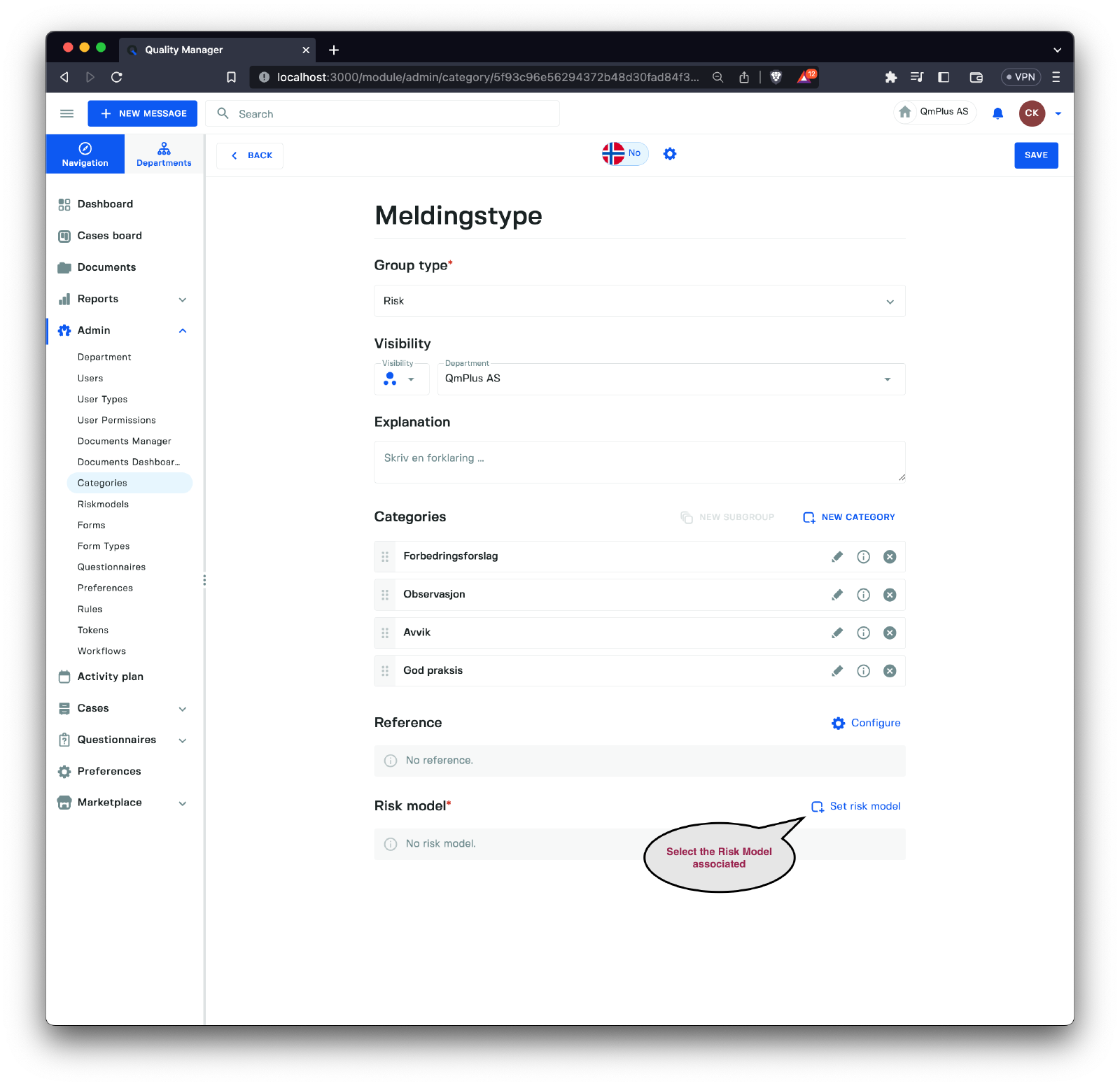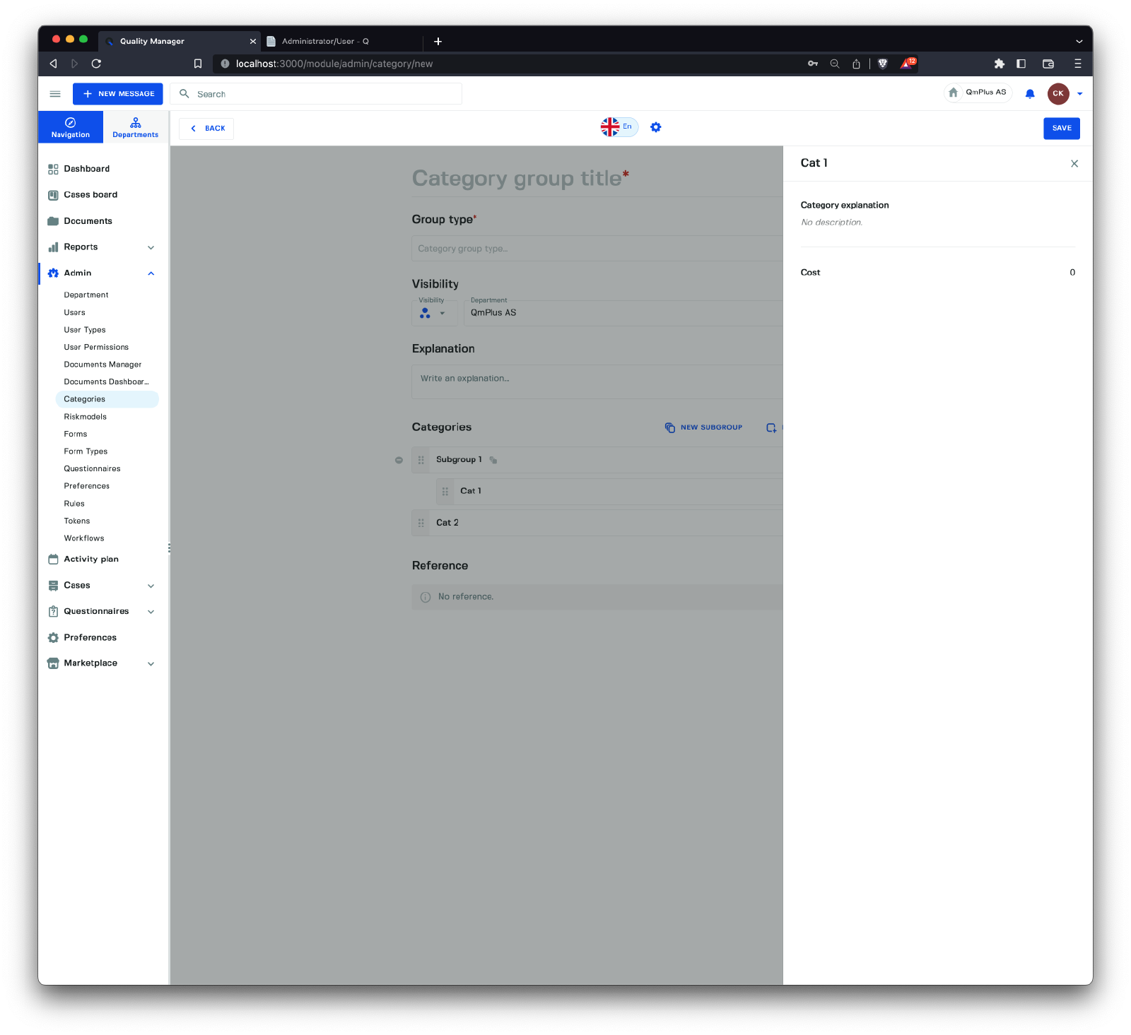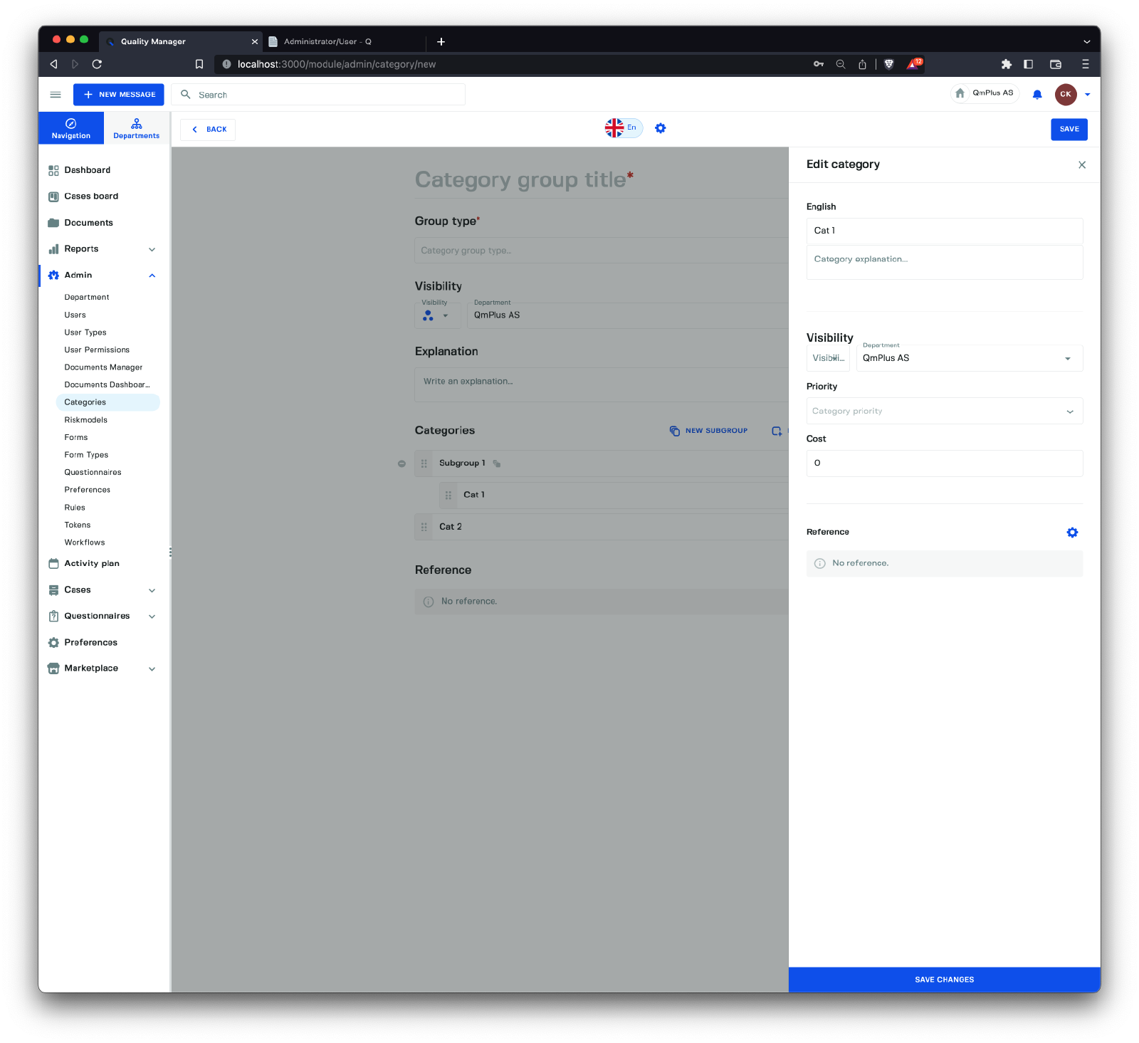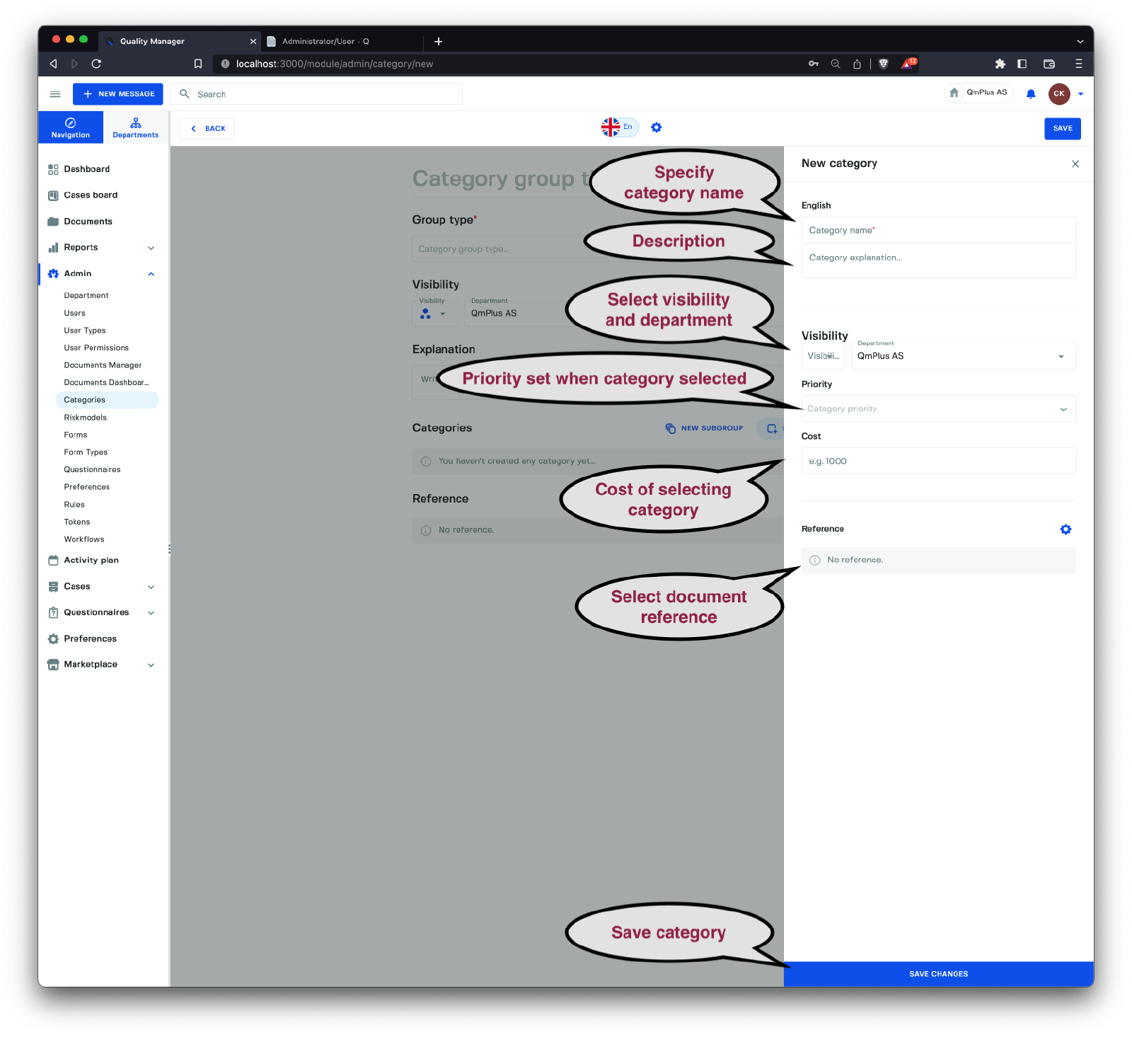 Reference | Allows you to specify a document reference to display with the category group in forms, for example, linking to a relevant law. This can also be done for sub-category groups and categories added. |