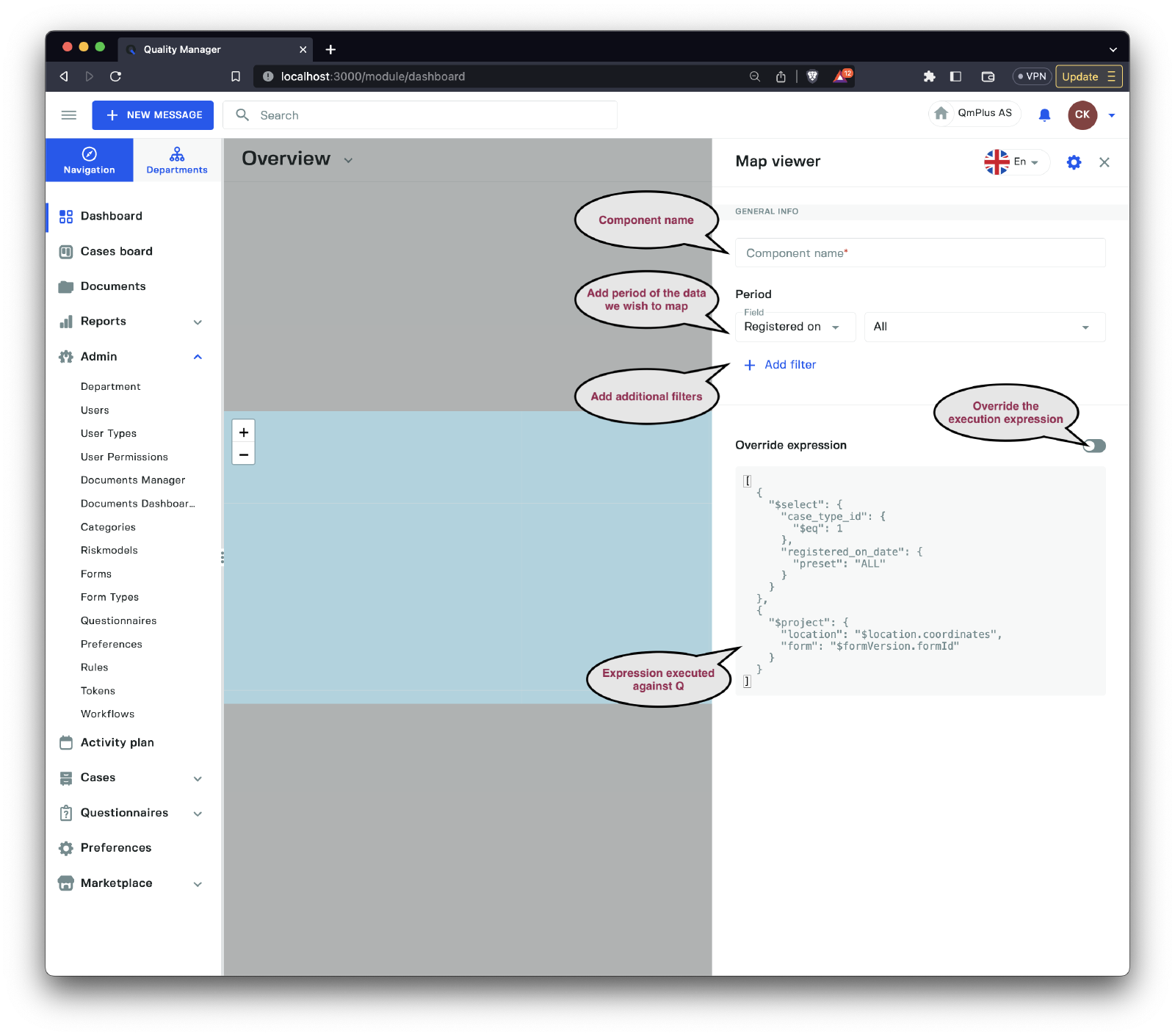 The map component allows you to create a query that will be mapped to a map instance if the message case has associated geo coordinates.