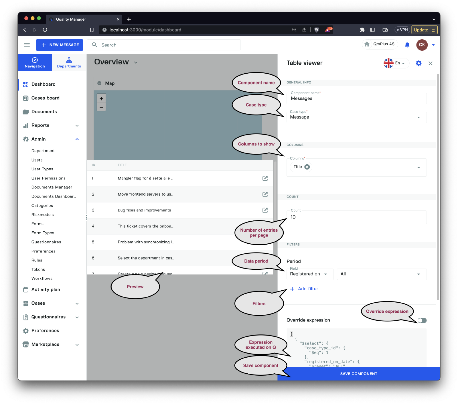 The table component is a list component that displays the results of a specific query. Here’s an overview of the options: