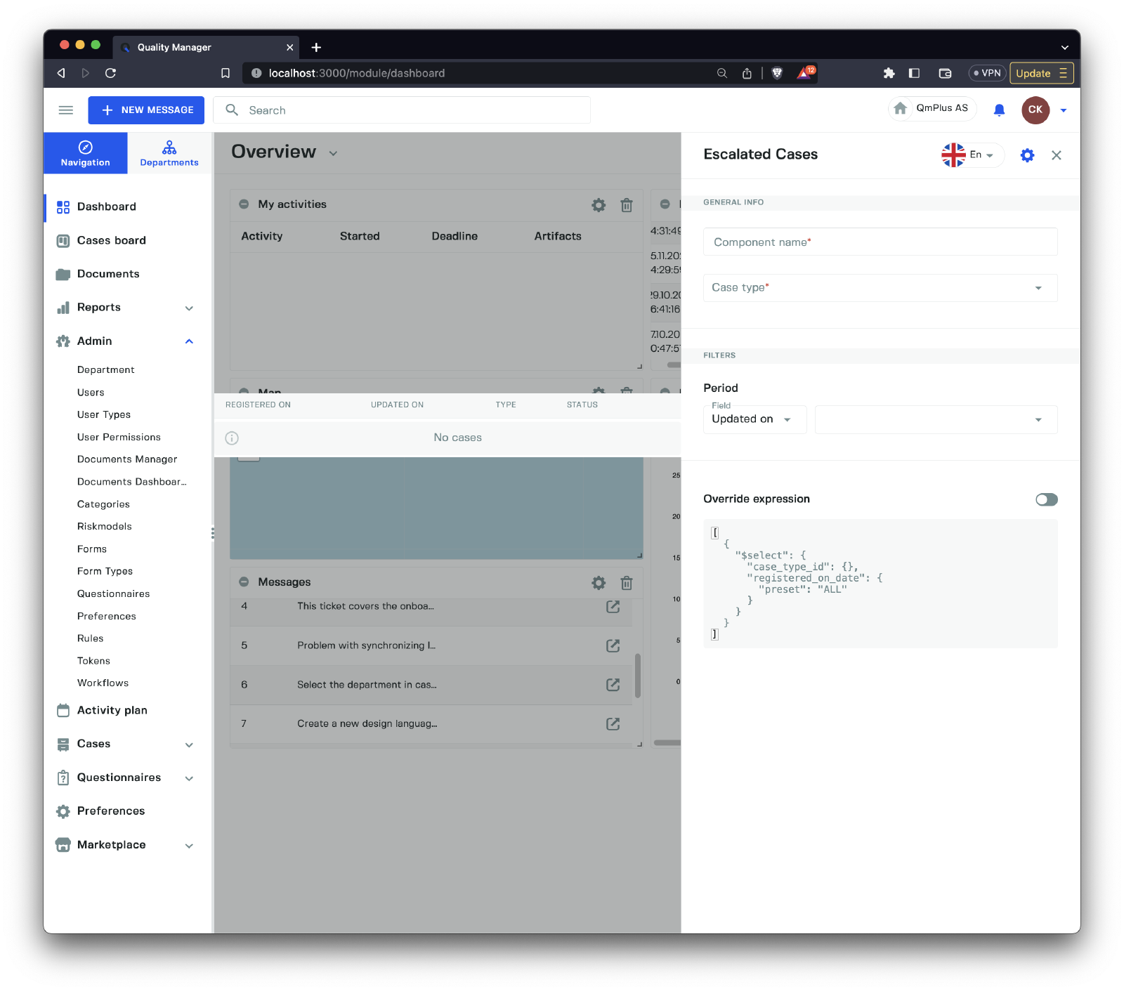 The Escalated cases component shows all the cases that have been escalated by the system within the period specified in the filters. This allows the logged-in user to view and operate on the escalated cases.
