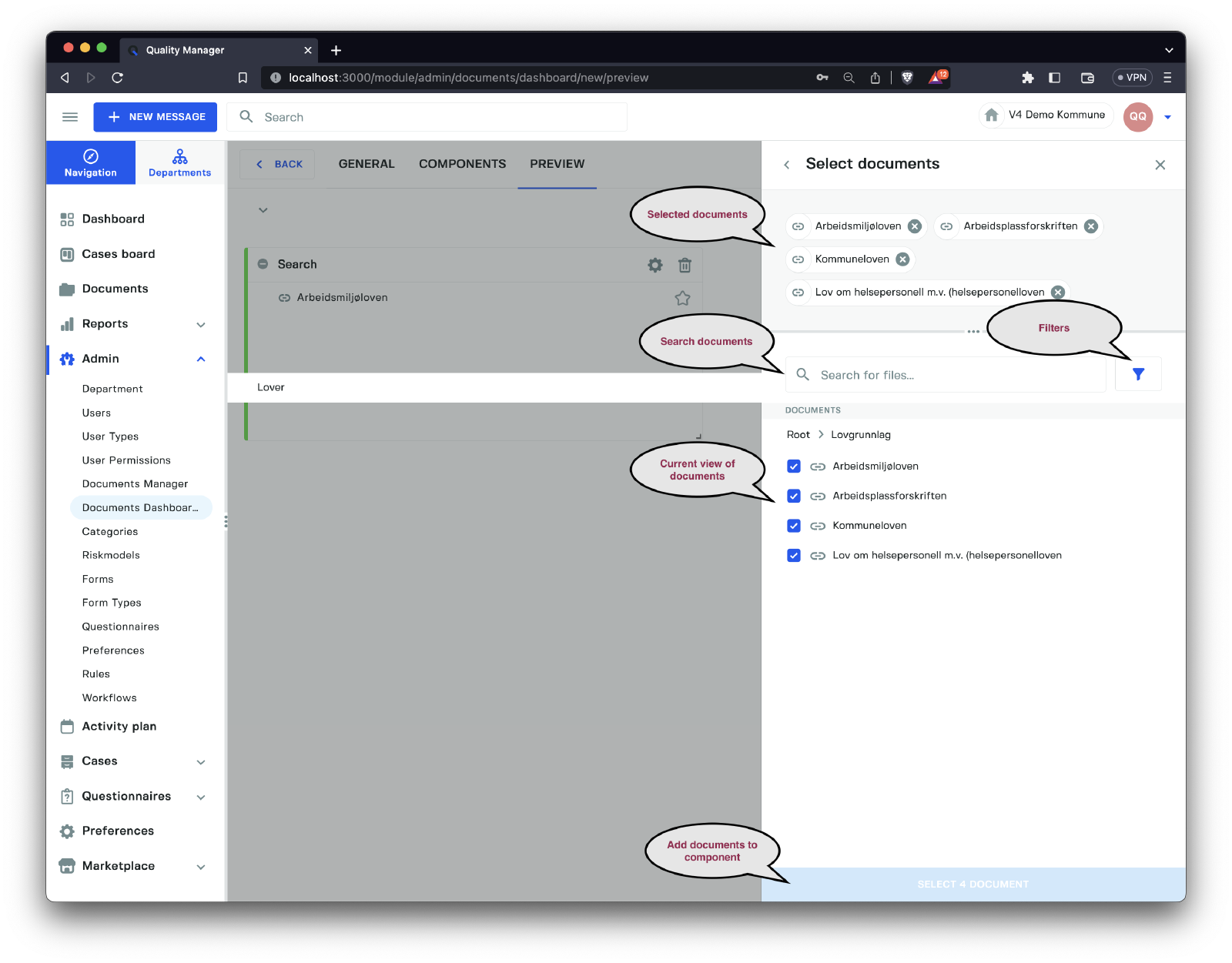 You can browse the document folders, filter, and search for files, then select multiple files to add at once. When you are ready, click the Select N documents button to add them to your Structure component.