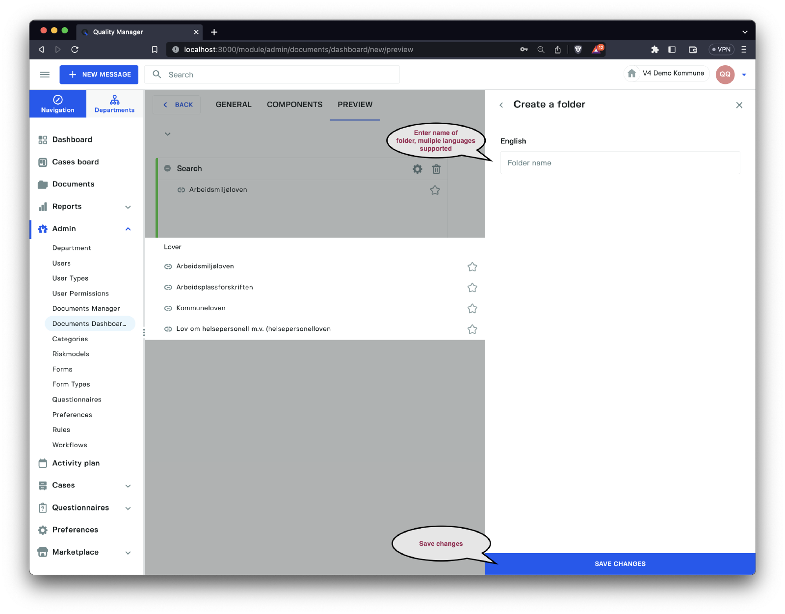 Enter the name of the folder (supports multiple languages) and click the Save changes button to add the folder to your structure.