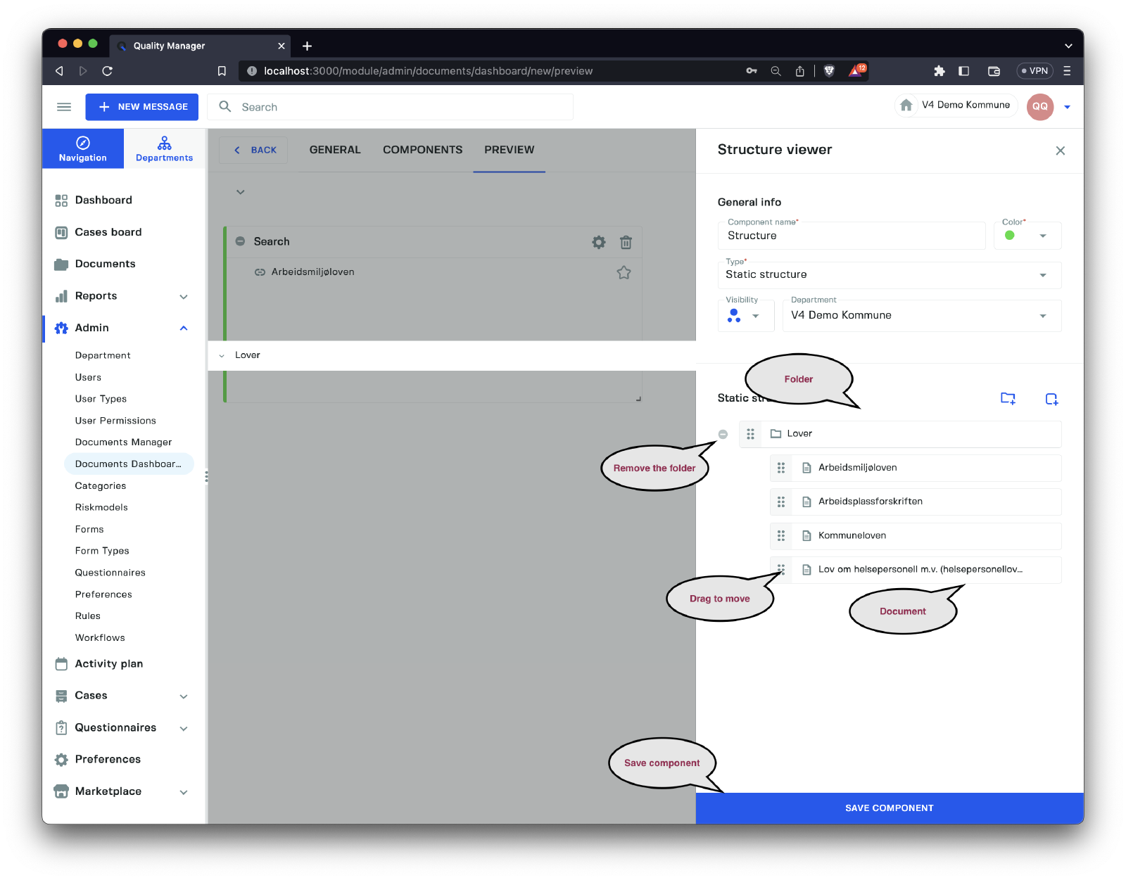 Above is an image of a Structured component containing a Folder and a couple of Documents. You can rearrange the order of the items by dragging them. To move a document under a Folder, drag it from left to right under a folder, and it will be attached underneath that Folder. Documents and Folders can also be removed from the structured component.