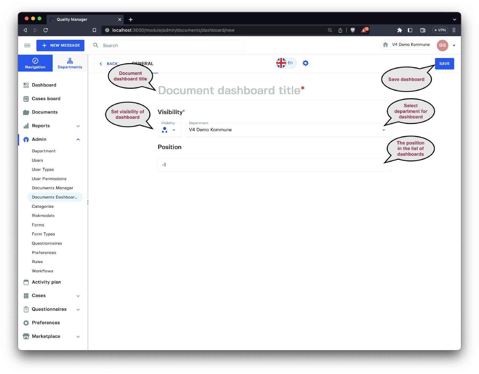 Position | The position in the list of dashboards that the user can see when they click the Documents option. |