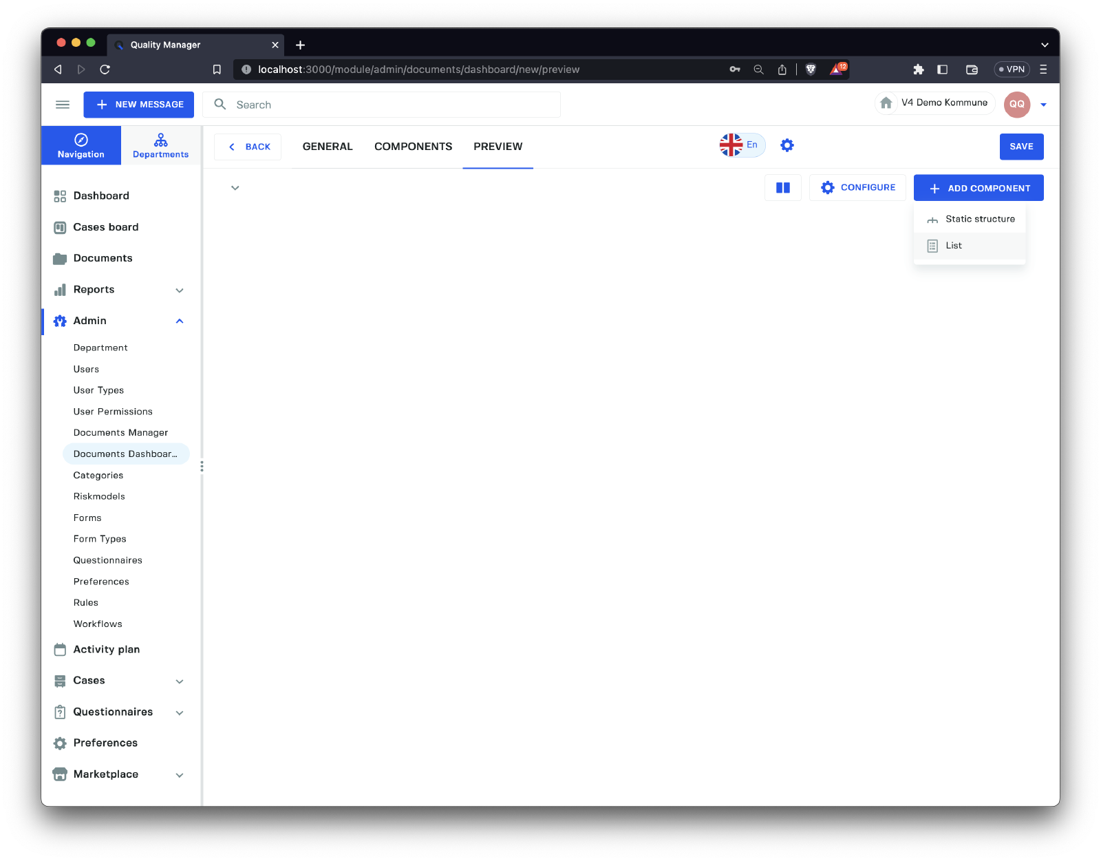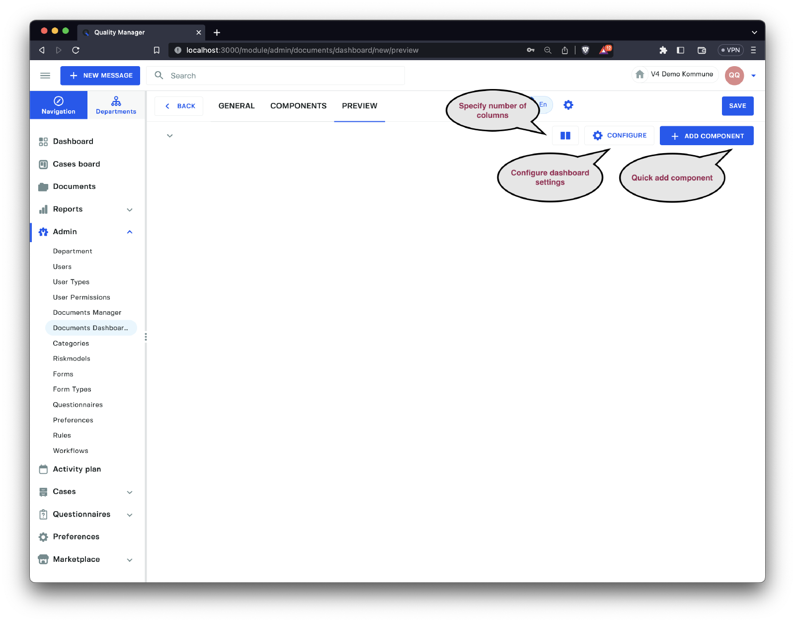 After filling in and selecting options, click on the Save button to create an empty Document dashboard, which allows you to build components for it.