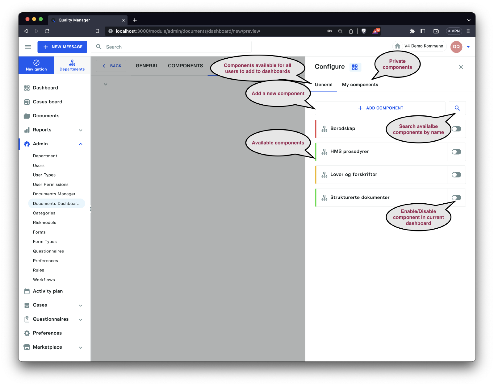 Components | A list of components added to the dashboard, including their visibility settings. This list shows all dashboard components regardless of their visibility and department settings. |