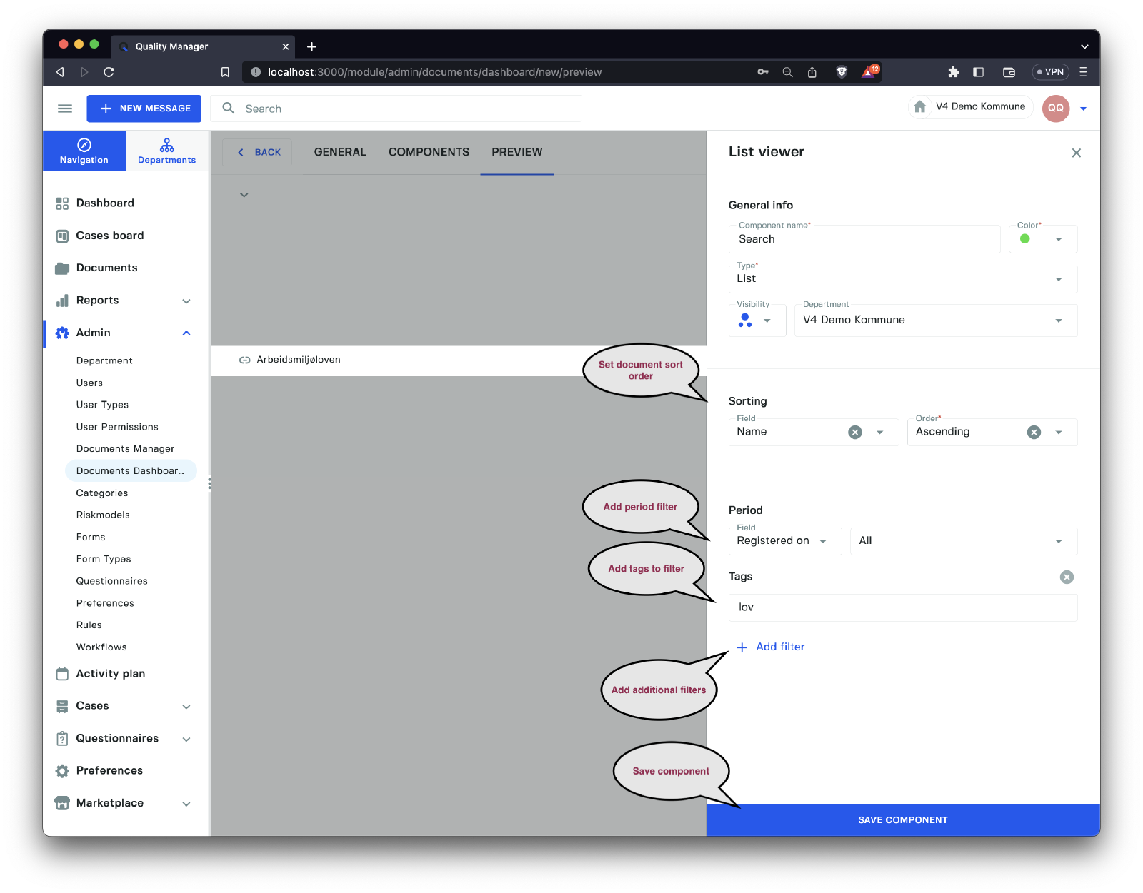 Preview | A preview/builder for components. This component updates when you change the currently selected department, allowing you to see how the dashboard looks depending on the selected department. |