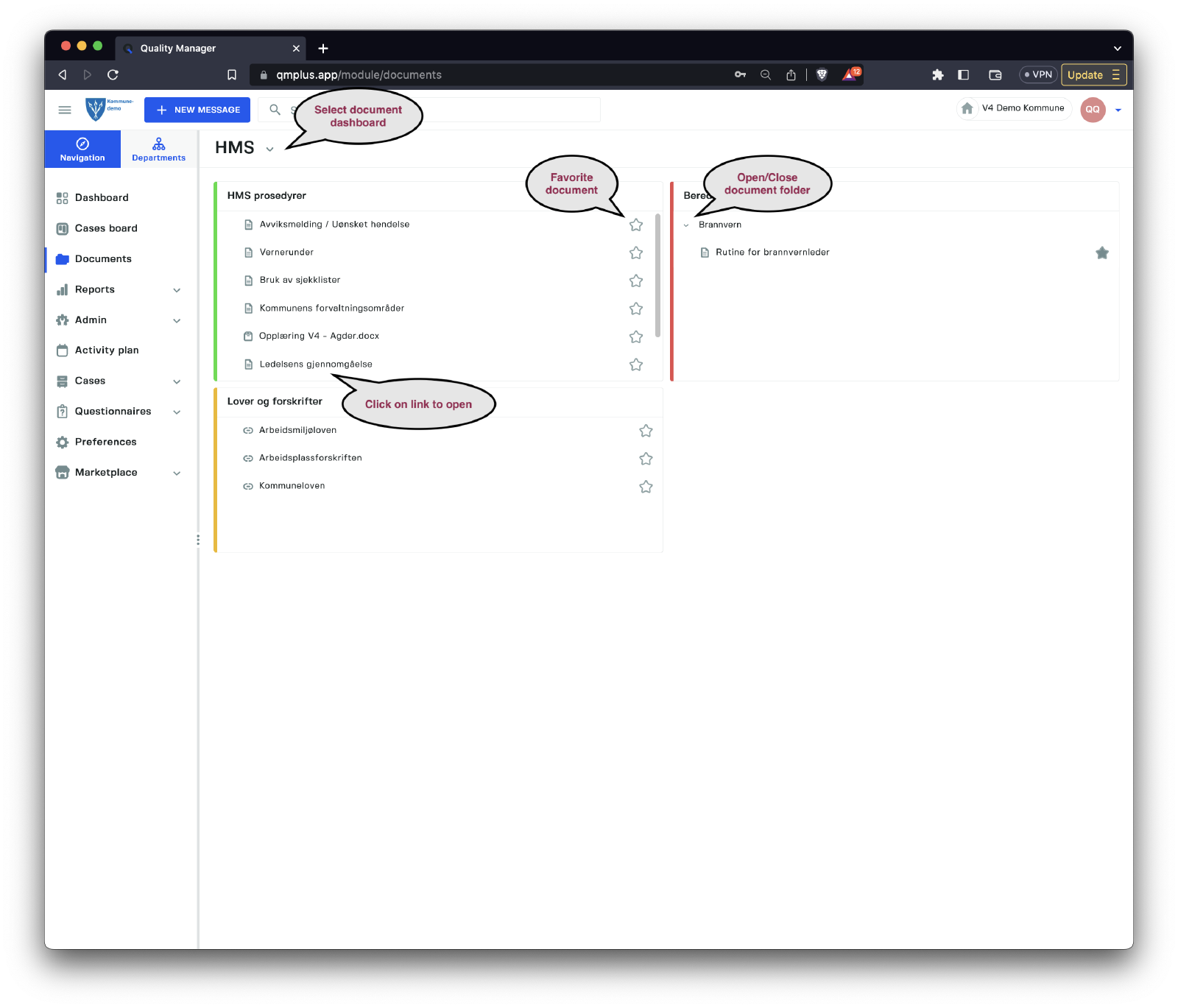 This section allows you to browse through the published document dashboards, access individual documents, and mark your favorite documents for easy access later.