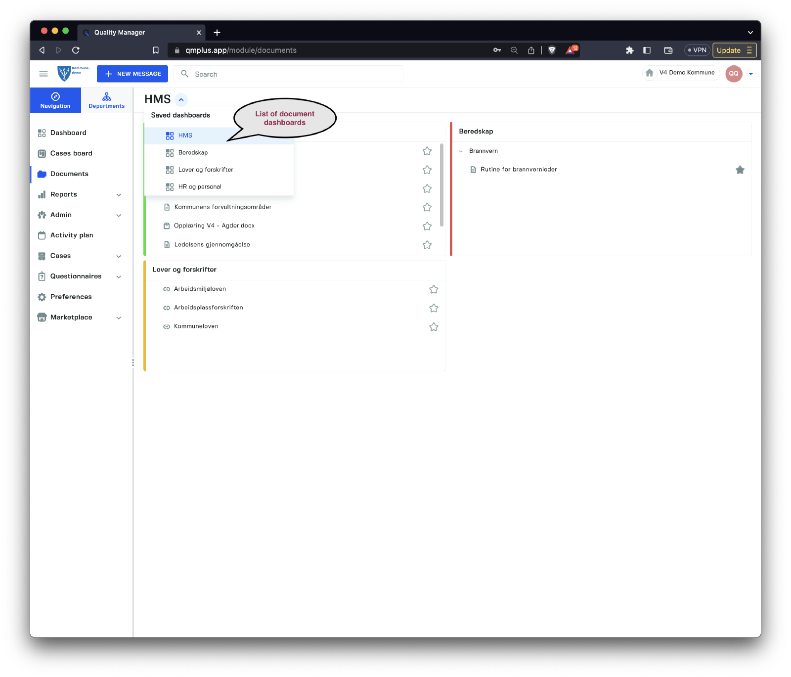 The Documents menu grants users access to all document dashboards that are visible to them based on their assigned department and permissions.
