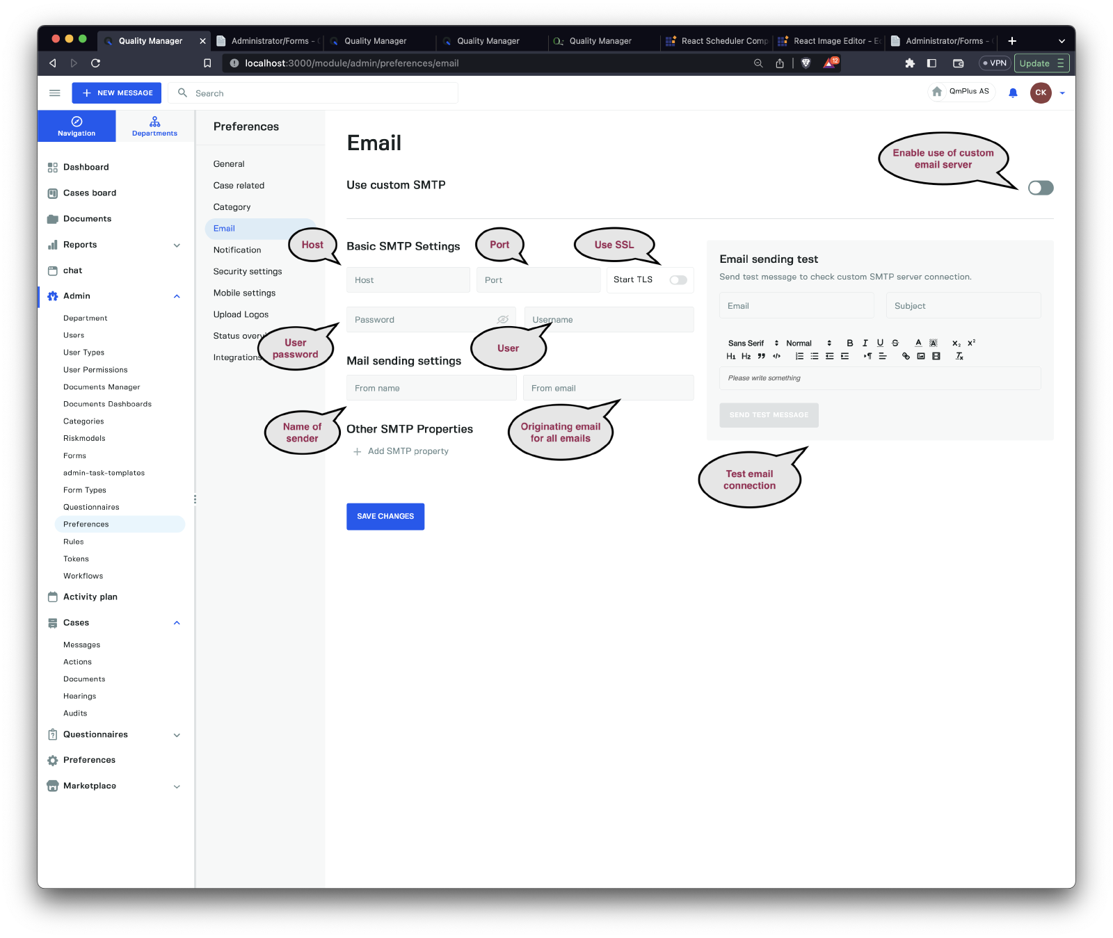 This section allows you to override the platform’s email sending settings. This lets the user use their own SMTP endpoint to send email from Q. This might be useful if the customer wants the notifications to be from their own email domain or if their email spam settings are making the delivery of regular email from Q impossible.