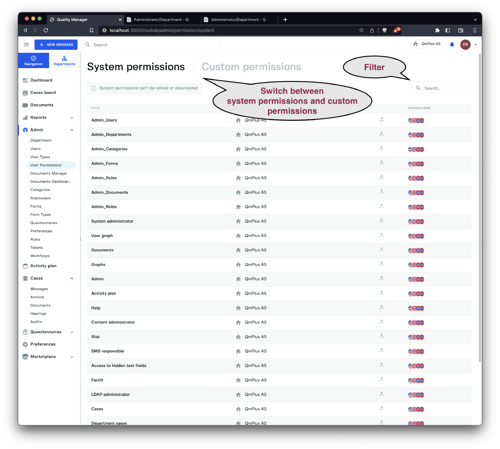 By clicking on Administrator/User Permissions, you can access the list of all available permissions.