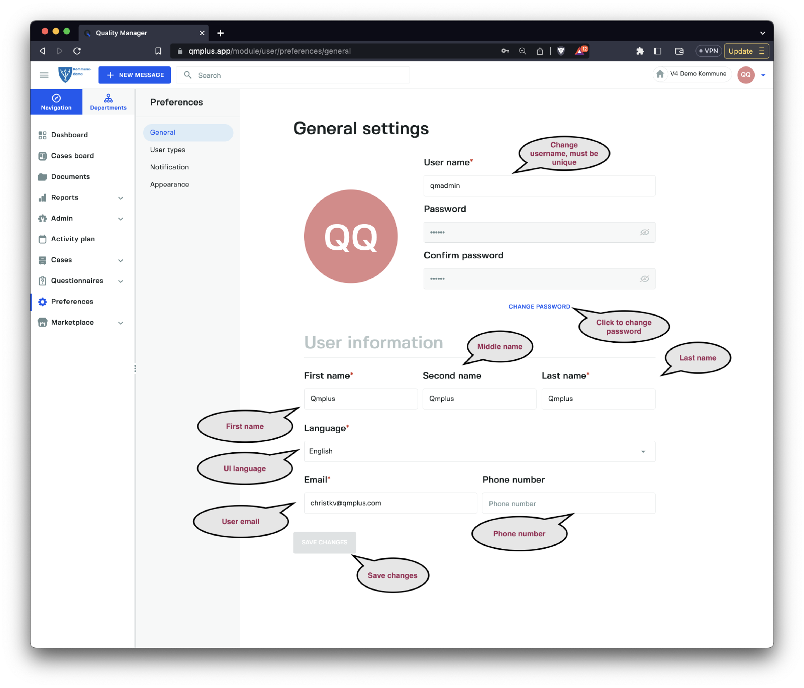Clicking on the Preferences grants access to the specific preferences of the user.