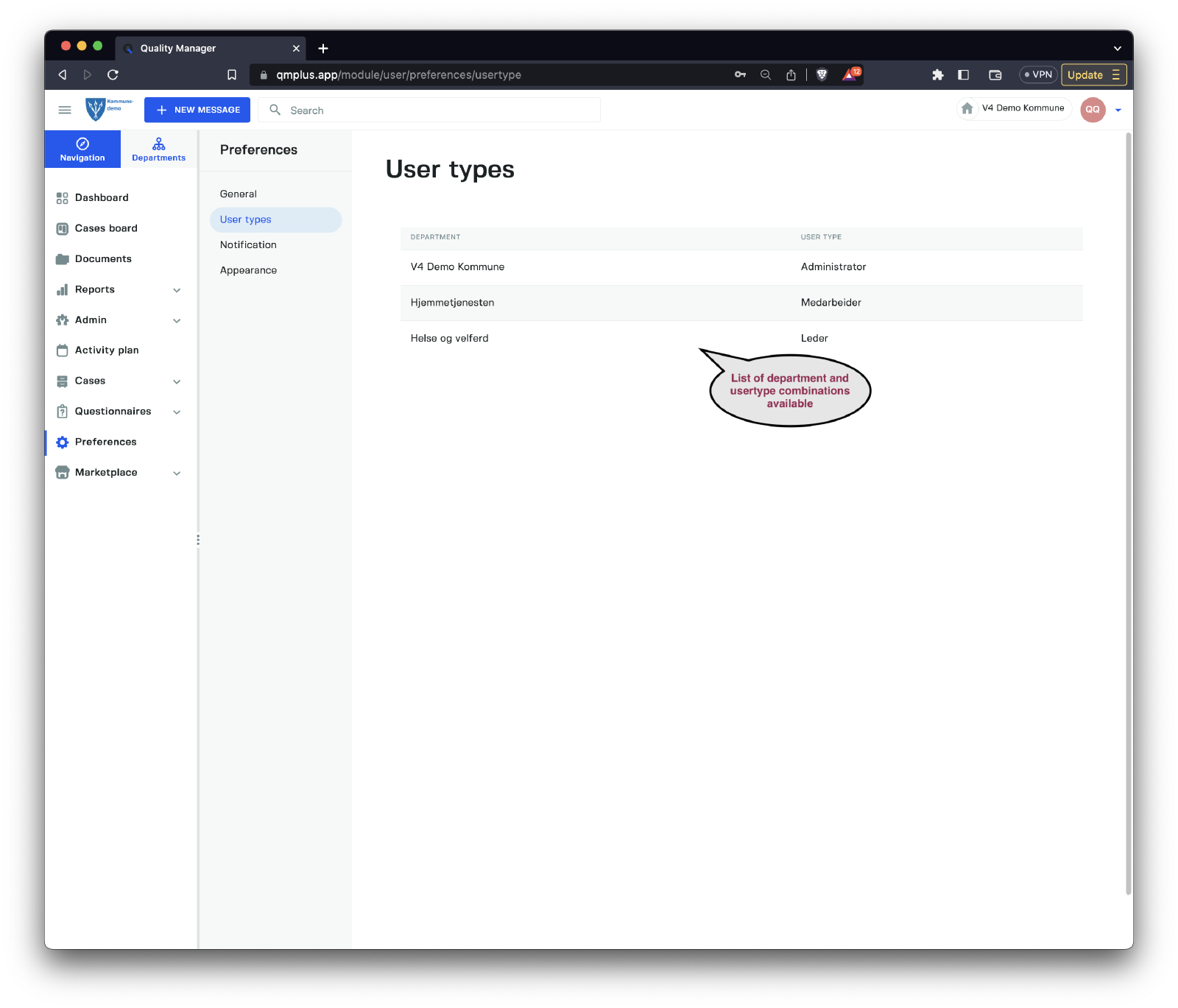 The User types option shows the current logged-in user the list of the department and user type combinations that are registered on their user.