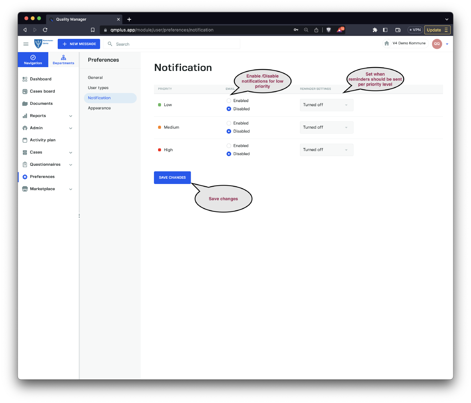 The notification settings are ordered by priority, enabling you to enable/disable notifications for any given priority level and set the delivery time for any reminders sent by email to the logged-in user.