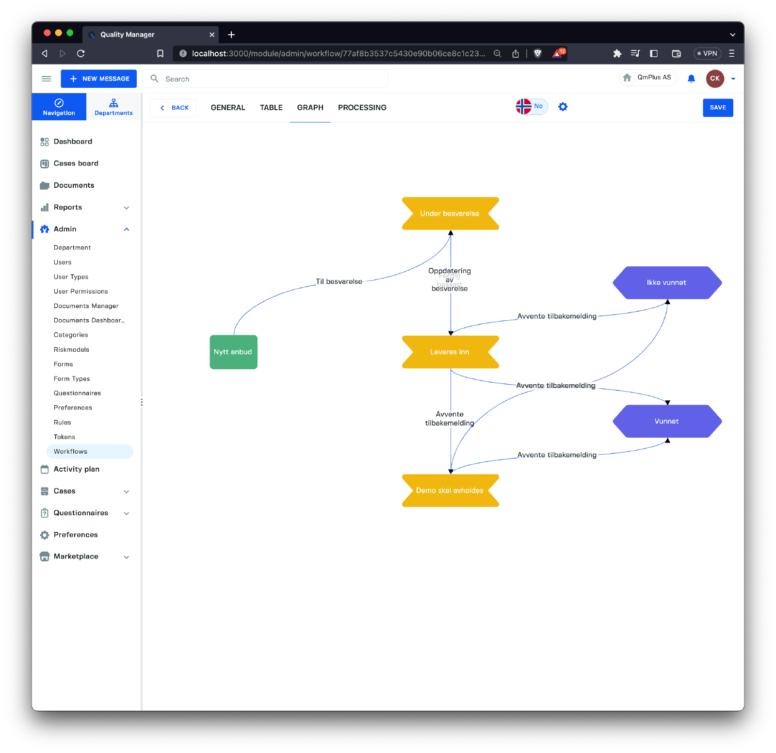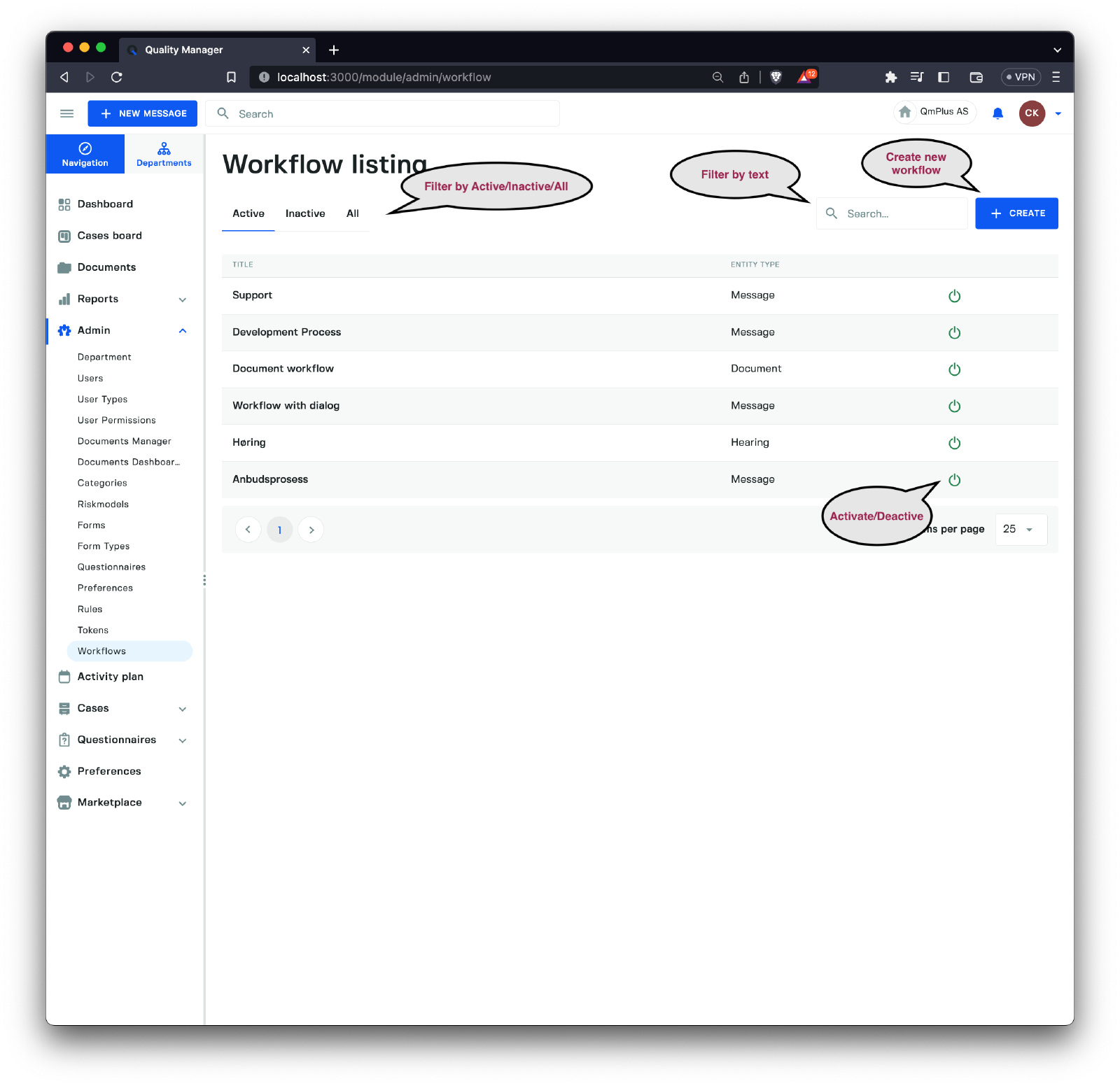 The Workflows list overview allows you to see all workflows defined in the system. Workflows are global and shared by all departments within the organization.
