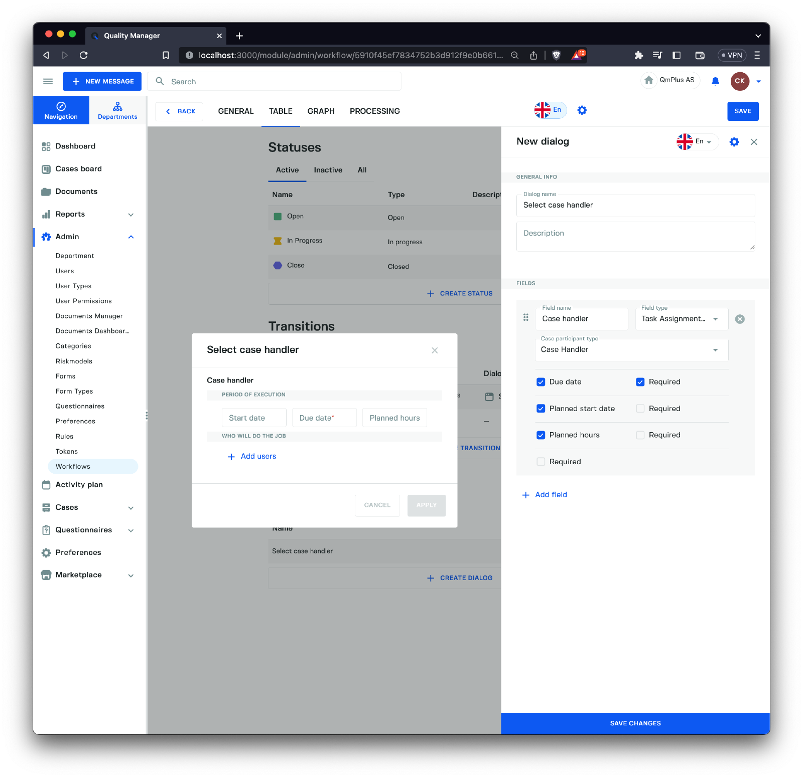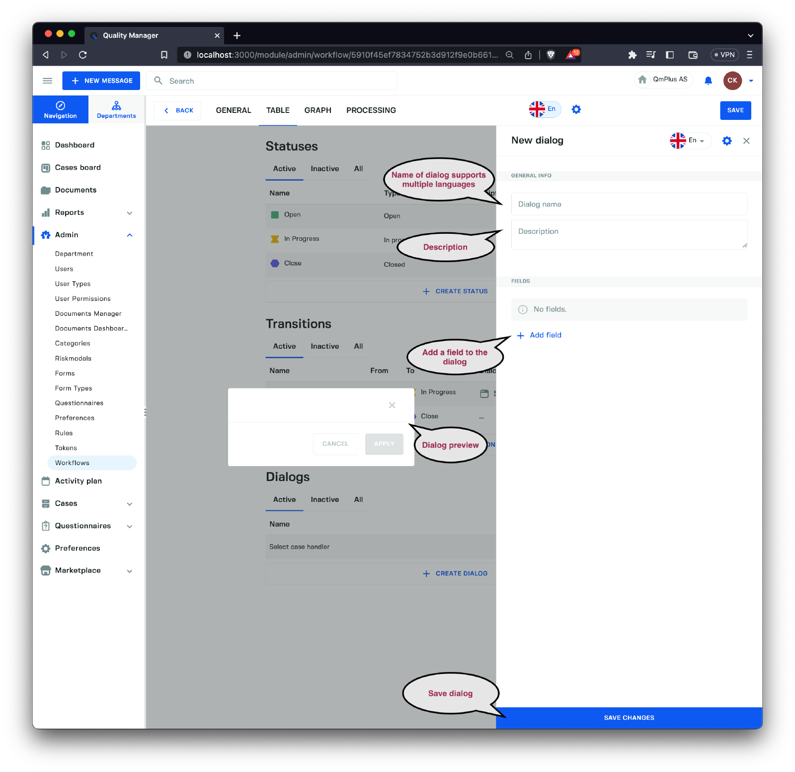 A dialog represents a set of fields configurable by the end user to collect information or trigger actions on a change of status for a case (a transition). Dialogs are attached to transitions.