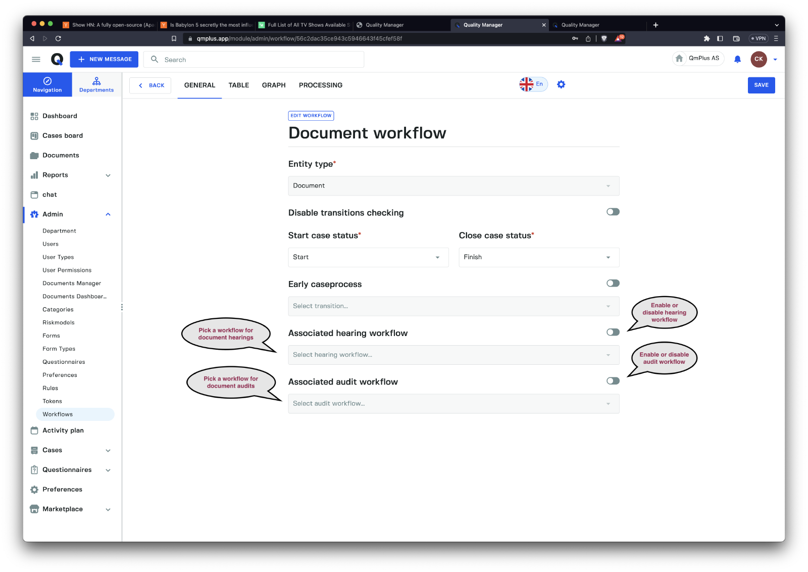 Associated audit workflow | Document only. Allows you to specify an associated audit workflow for this document workflow to handle all hearings. |