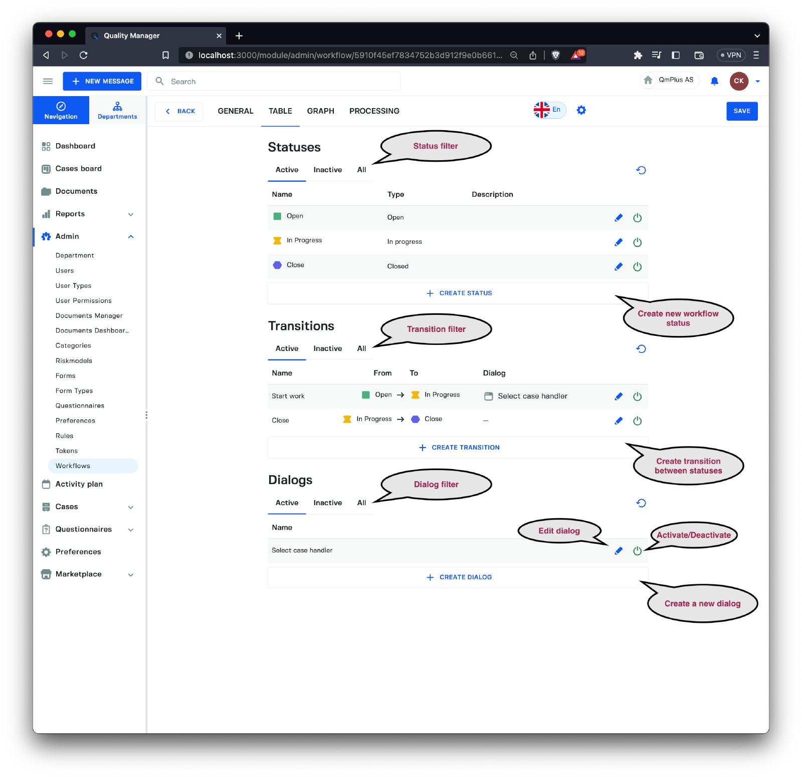 Table | Edit the statuses, transitions, and dialogs that make up the workflow. |