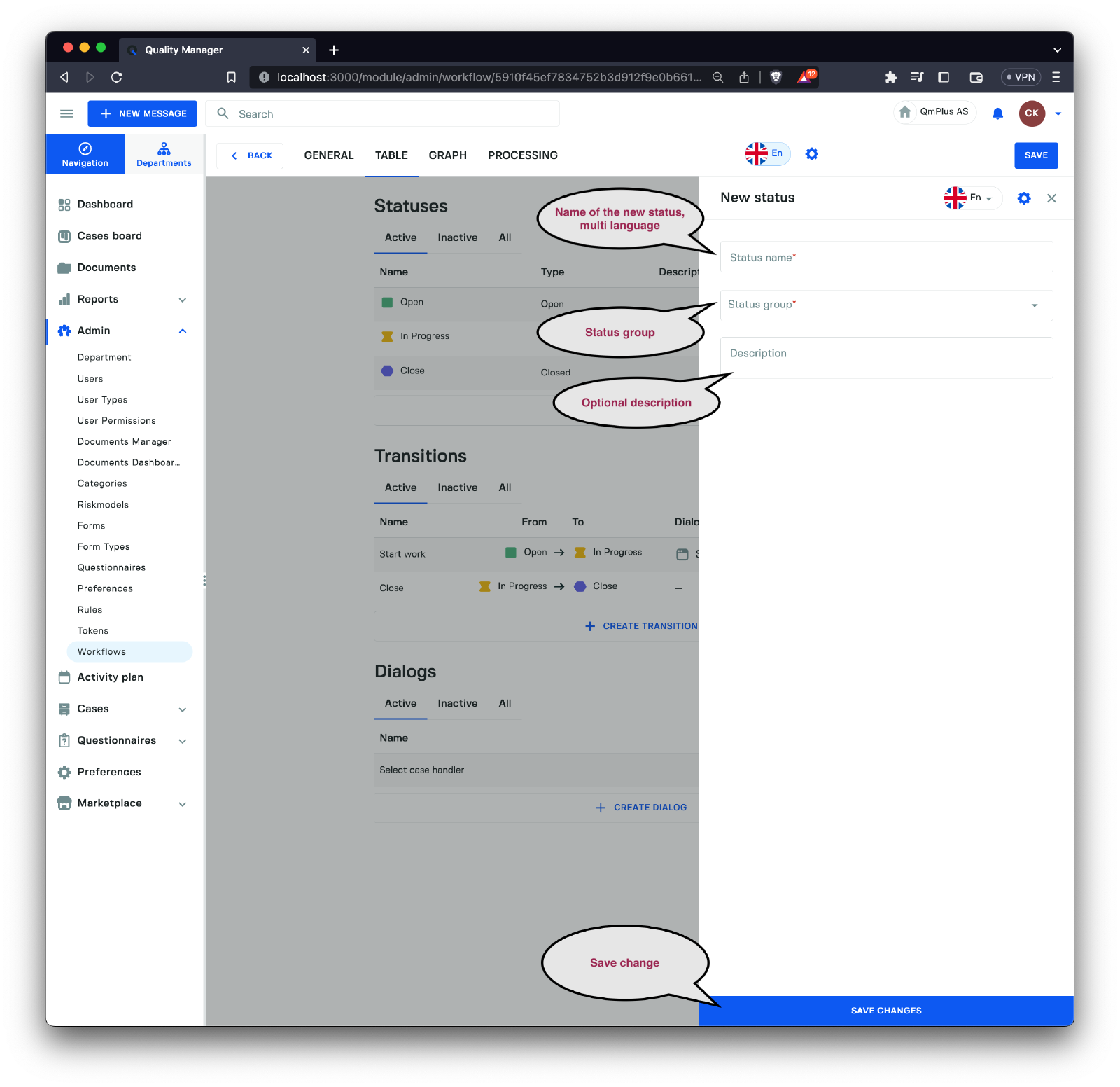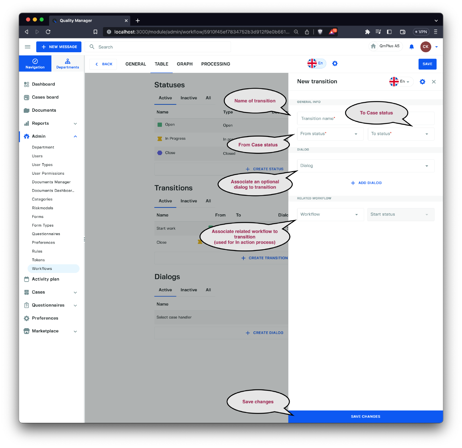 Transitions | Transitions control the flow of cases between case statuses. It makes it possible to enforce a workflow by specifying the legal transitions between statuses. For example, you might make it possible to only move a case from New to Under work by adding a single transition between those statuses. |
