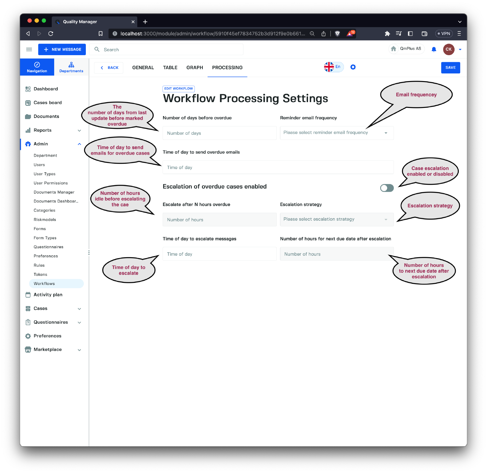 Formslet you override these so you can for example have a formAccidentthat have much shorter automatic escalation date compared to the general workflow.Formsettings will override the workflow.
