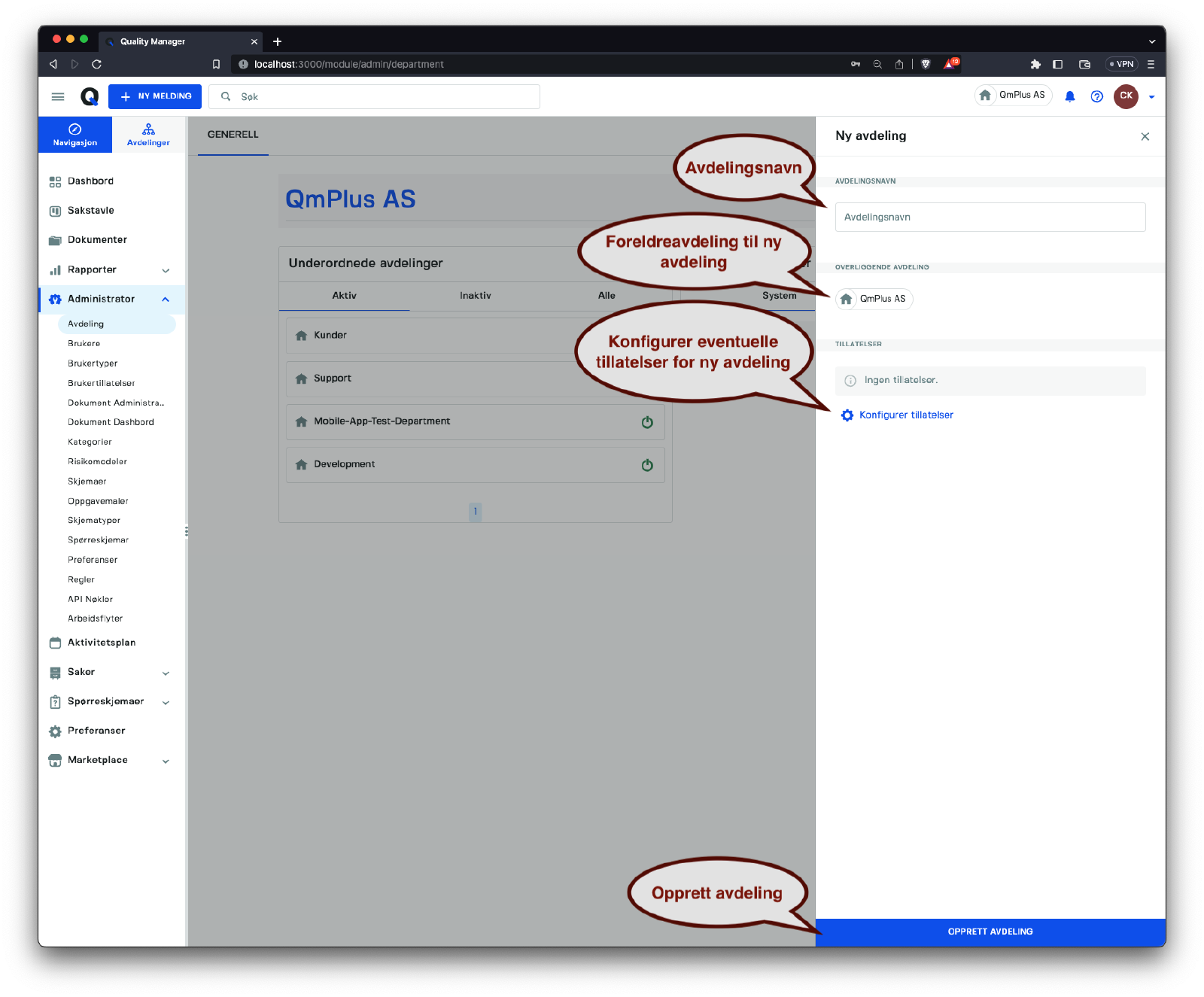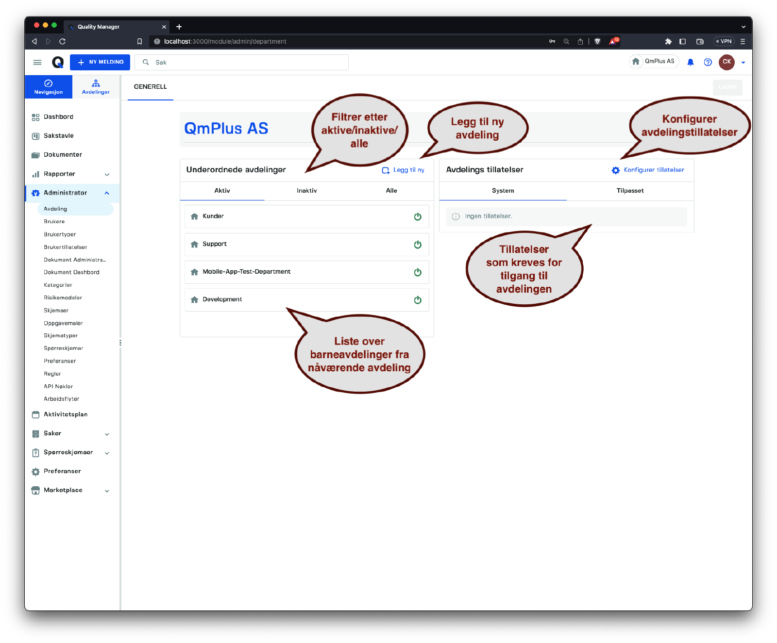 Denne delen tar for seg styring av avdelinger i systemet, inkludert opprettelse og konfigurering av avdelinger og deres respektive tillatelser.