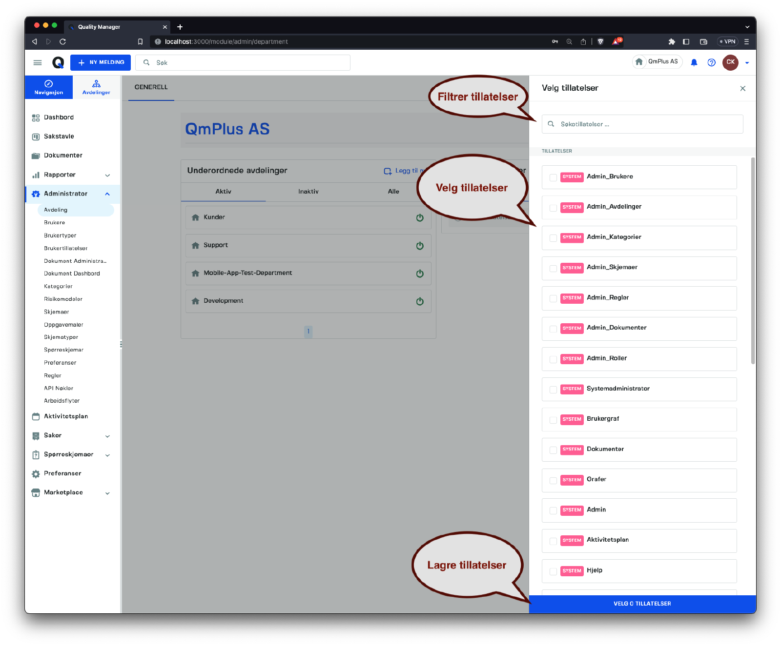 Ved å klikke på konfigurer tillatelser-lenken kan du åpne tillatelsespanelen for å velge og tildele tillatelser til den valgte avdelingen.