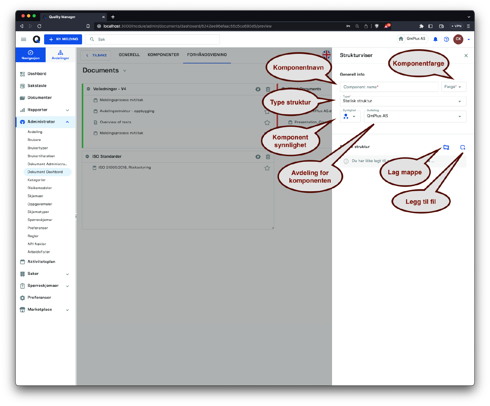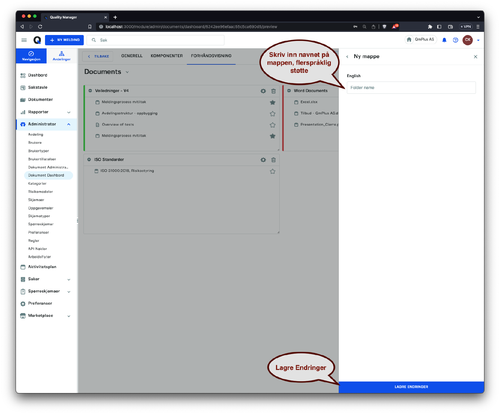 Ved å klikke på Legg til mappe-ikonet åpnes en sidebar som lar deg lage en ny dokumentmappe og legge den til i Struktur-komponenten din.