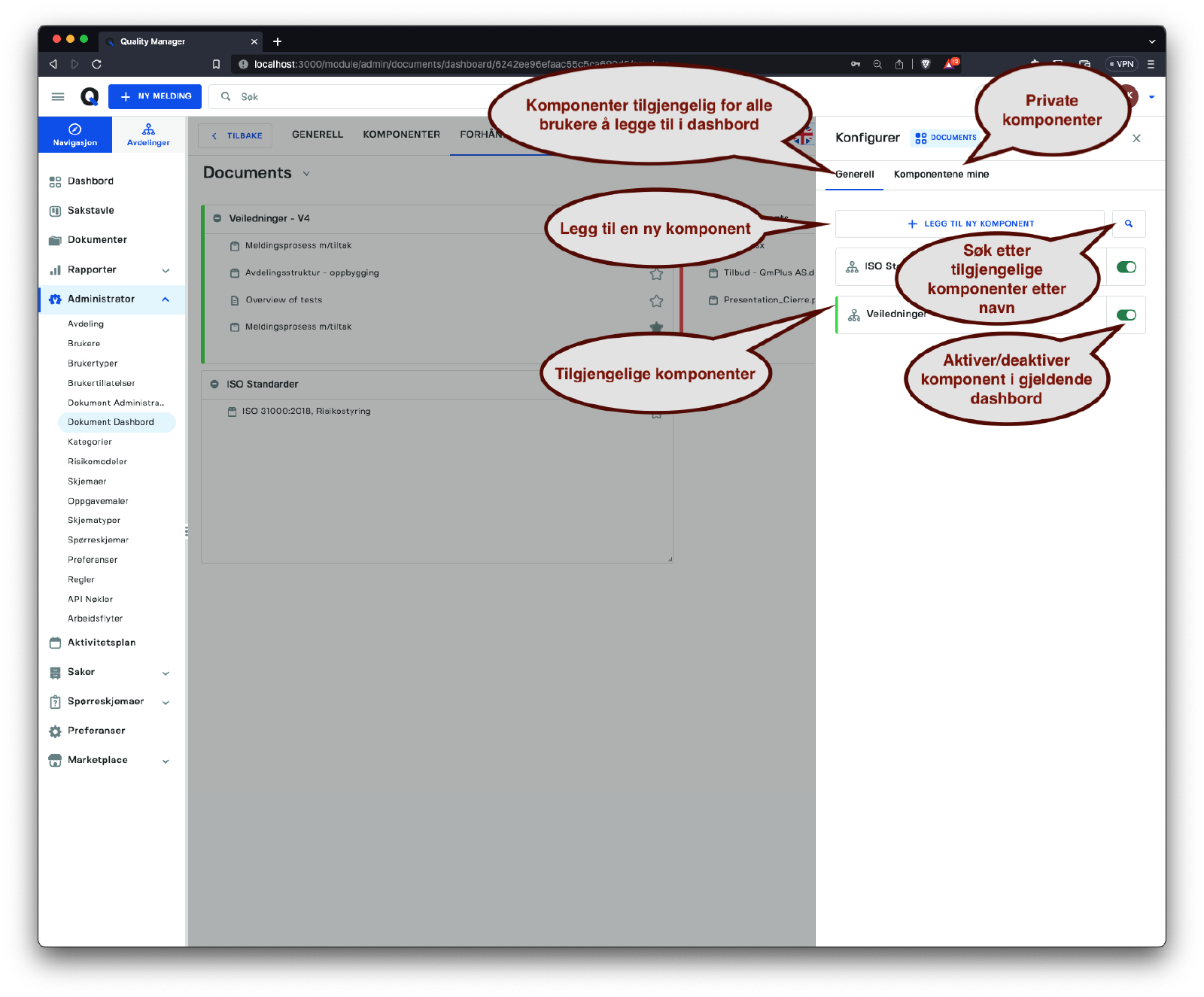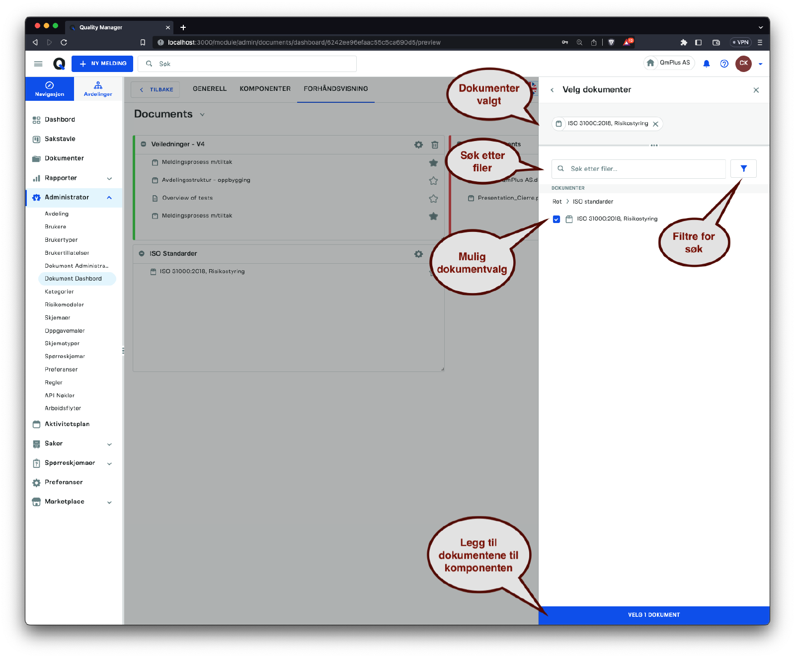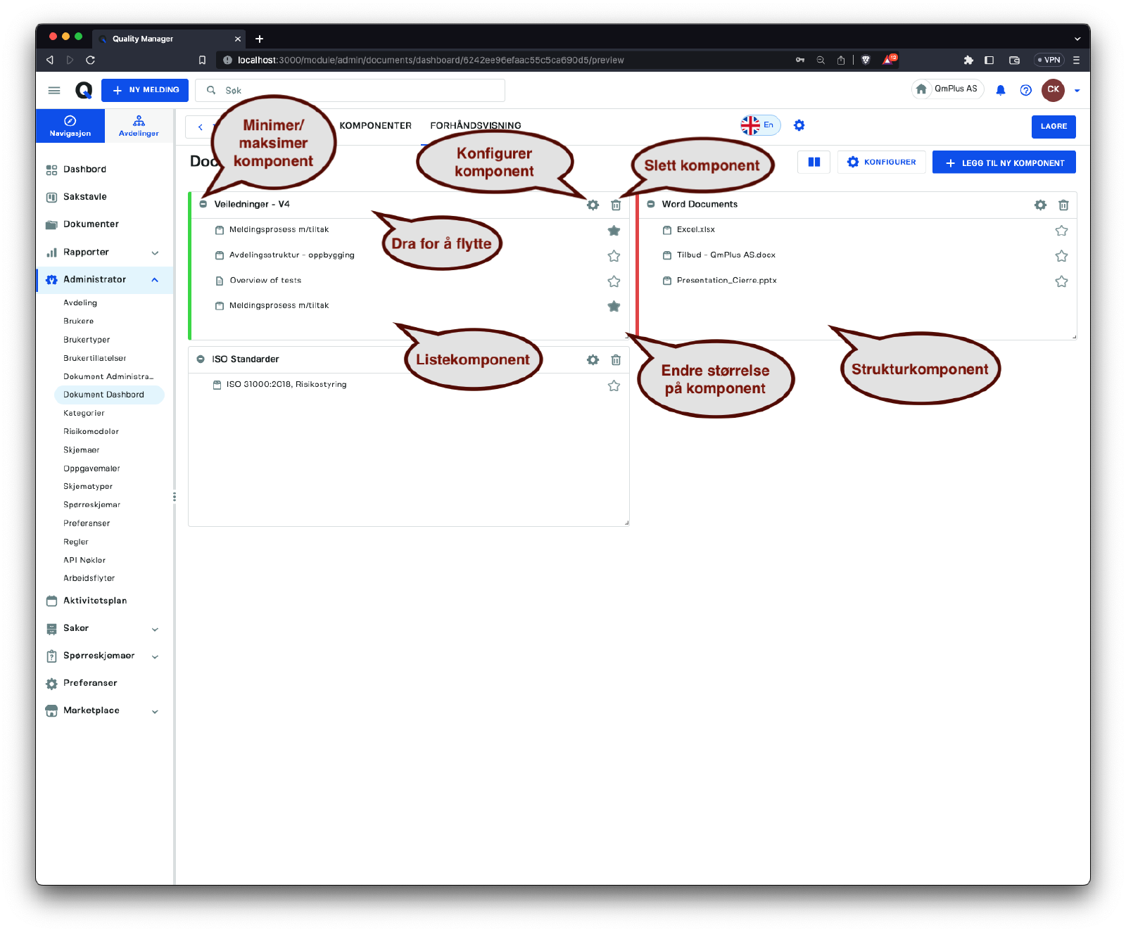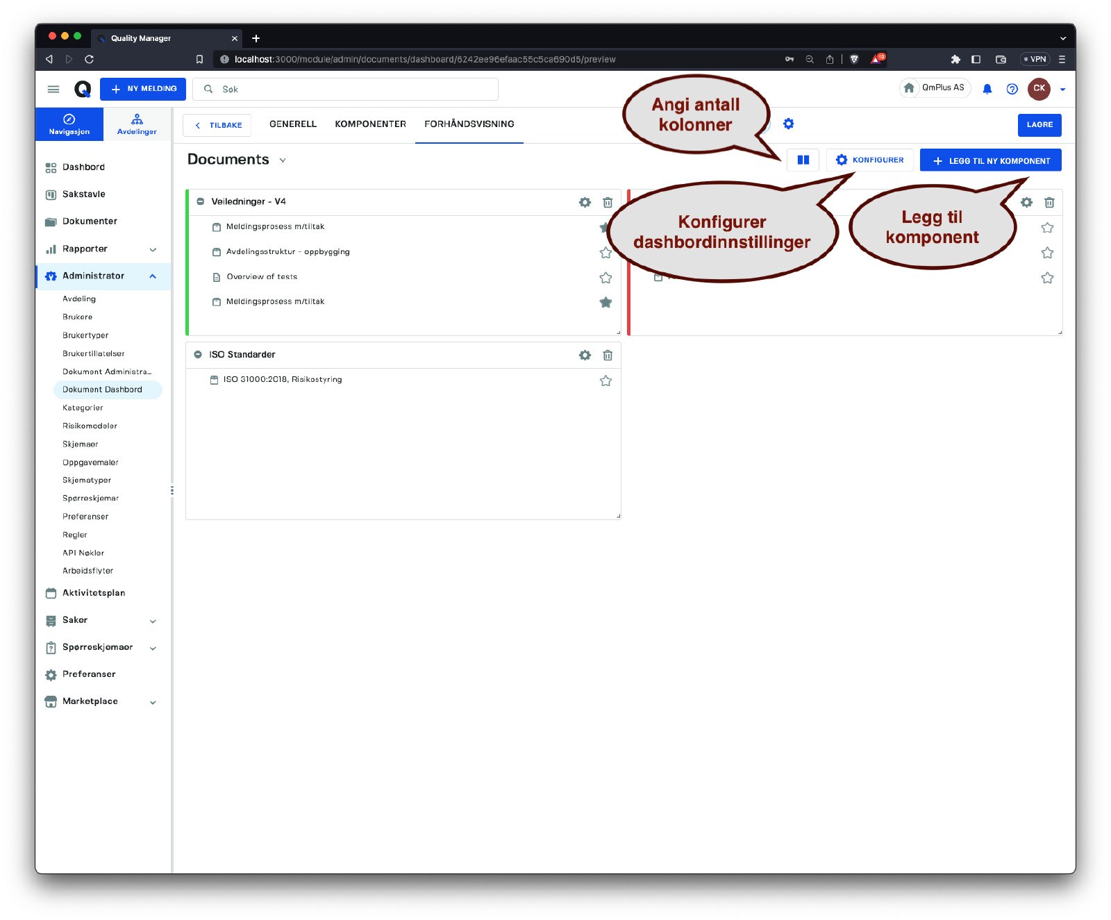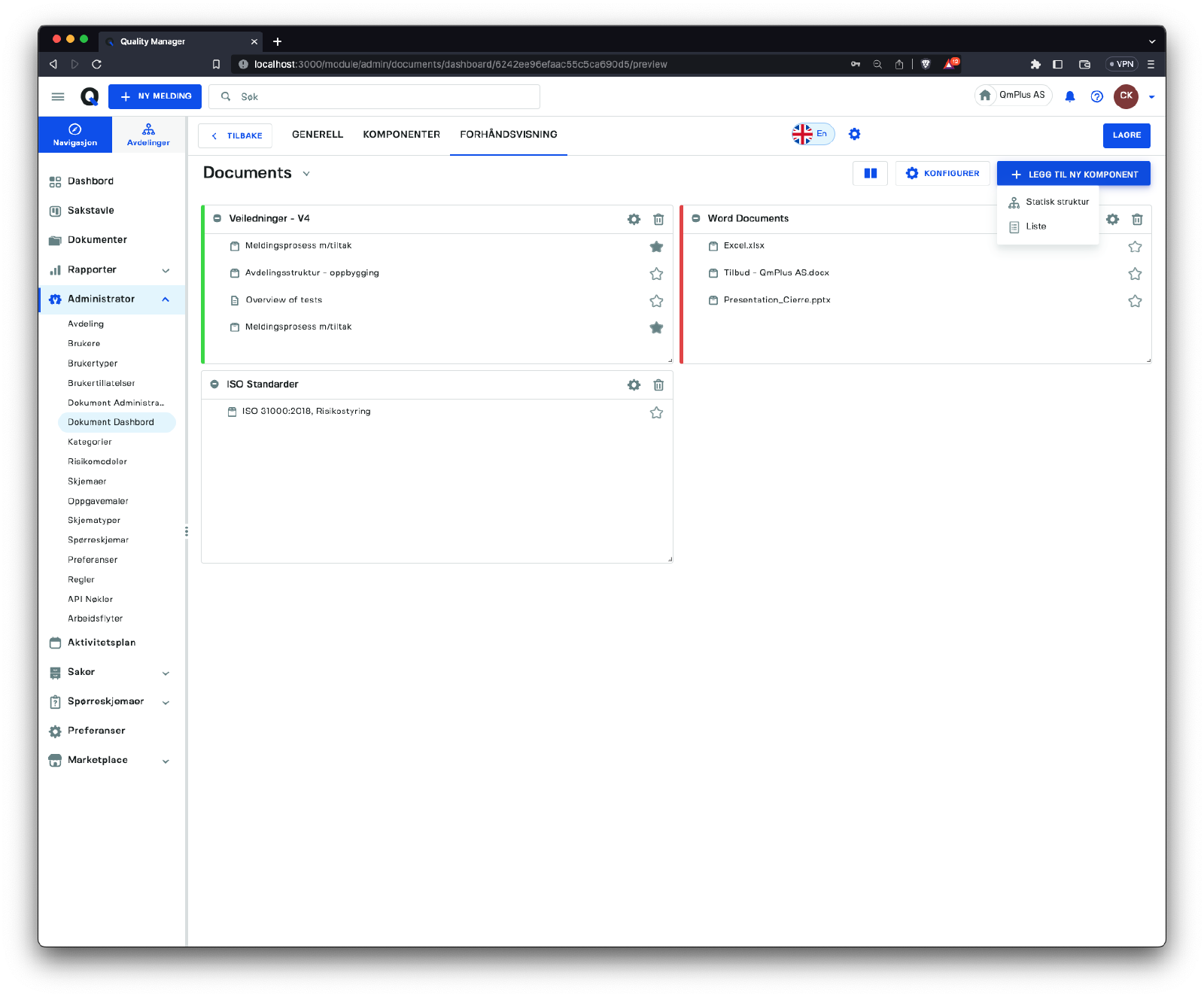 Ved å klikke på Administrator/Dokument Dashboard får du tilgang til dokumentbehandleren. Dokumentdashbord lar deg organisere visningen av dokumenter for sluttbrukere ved å velge fra dokumentbiblioteket ditt (som representeres av dokumentbehandleren) og bygge strukturkomponenter eller søkekomponenter for å vise dokumentene.