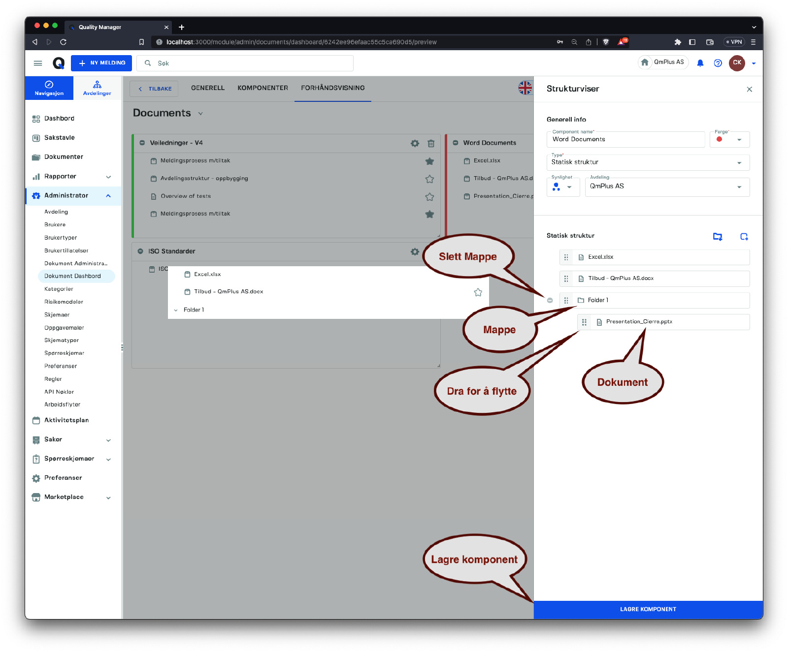 Ovenfor er et bilde av en Struktur-komponent som inneholder en Filmappe og et par Dokumenter. Du kan endre rekkefølgen på elementene ved å dra dem. For å flytte et dokument under en Filmappe, drar du det fra venstre til høyre under en mappe, og det vil bli festet under den Filmappen. Dokumenter og mapper kan også fjernes fra strukturkomponenten.