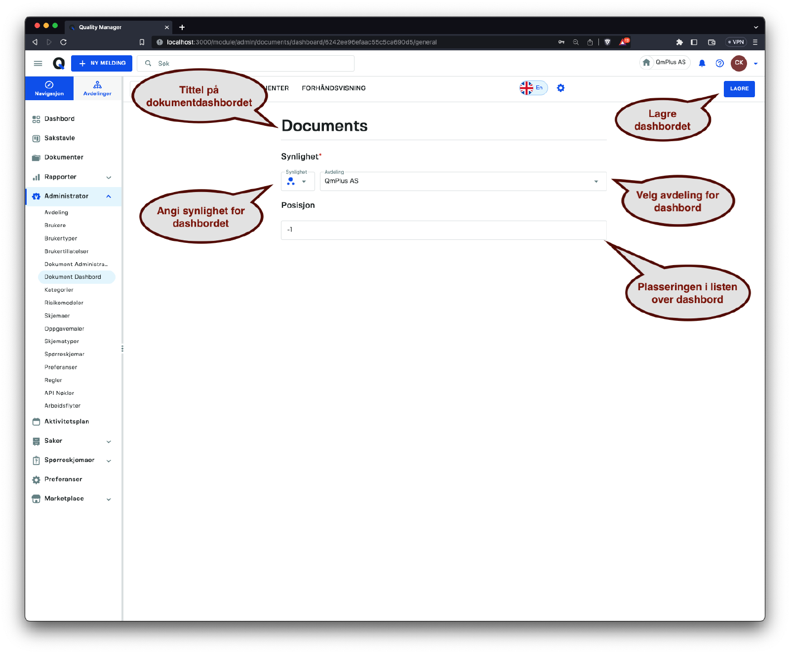 For å lage et nytt Dokument Dashboard må du fylle ut følgende felt: