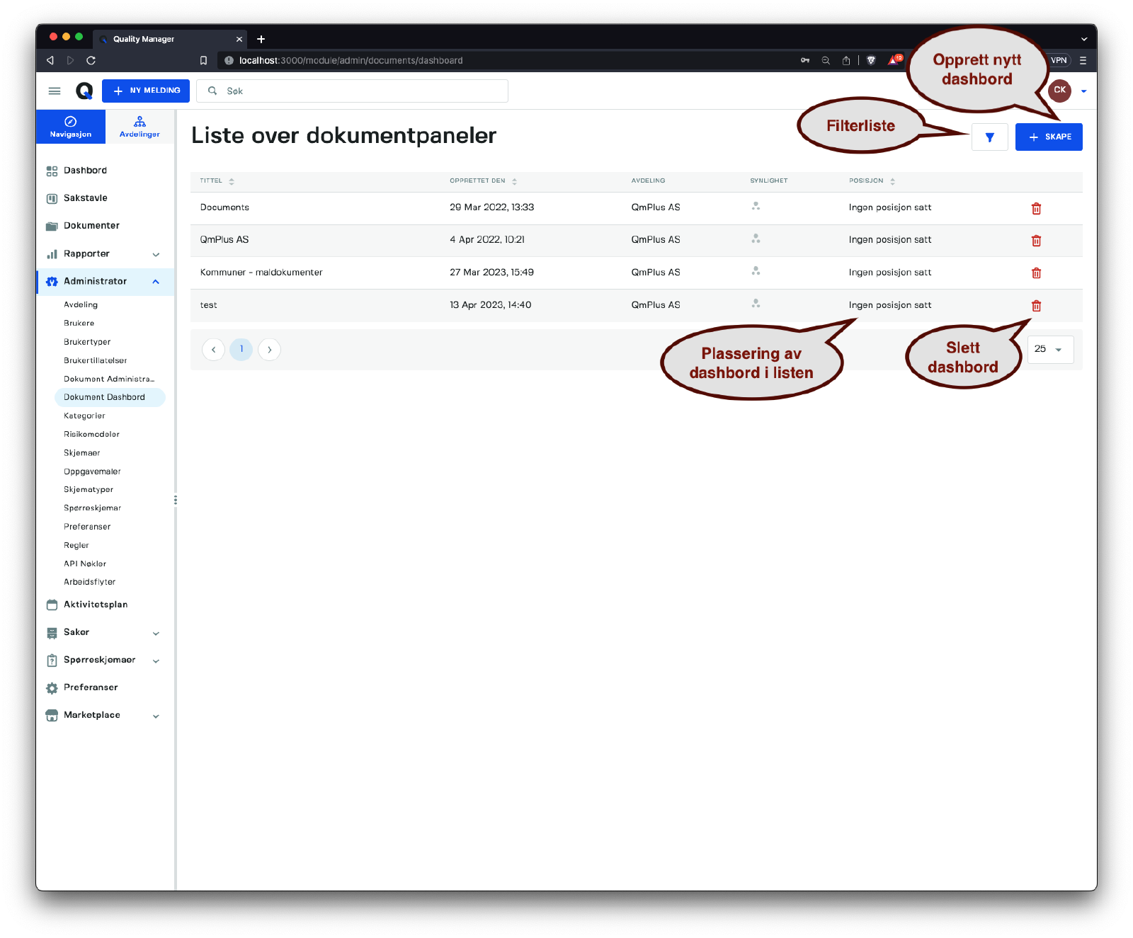 Listen over dashbord gir grunnleggende informasjon om hvert dashbord, inkludert tittel, opprettelsesdato, avdelingen som dashbordet er registrert på, synlighet og posisjon i listen over dashbord som brukeren vil se. Fra dette grensesnittet kan du også slette dashbord.