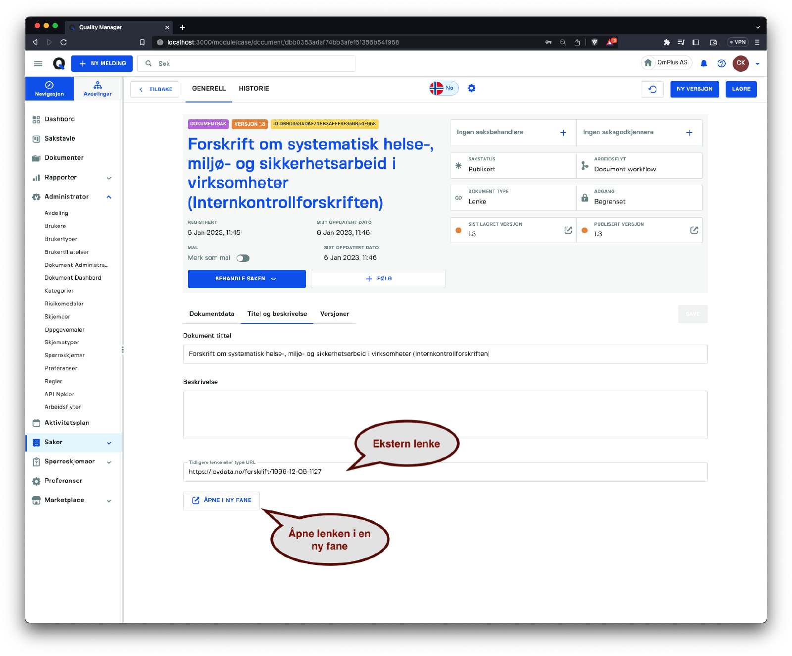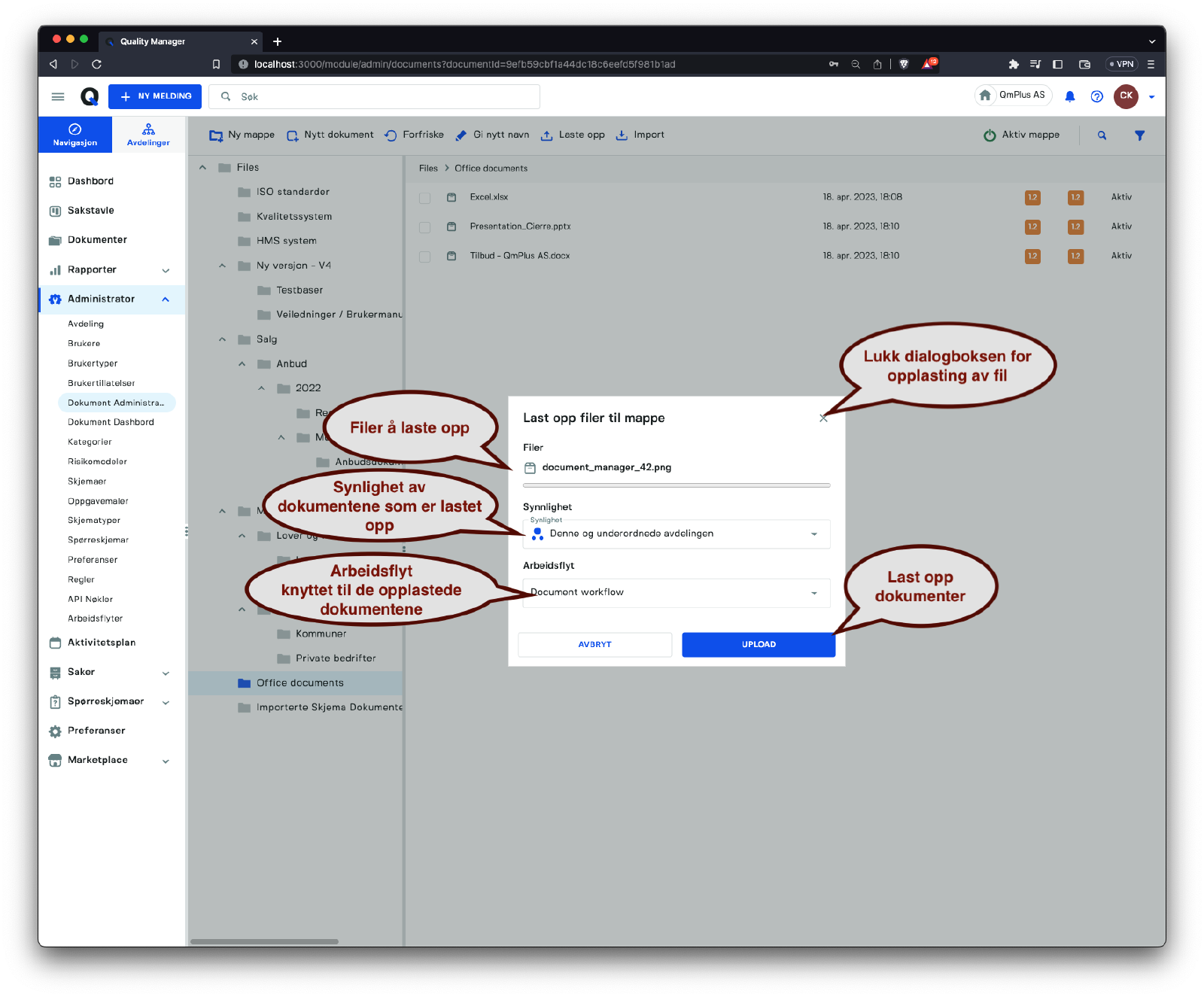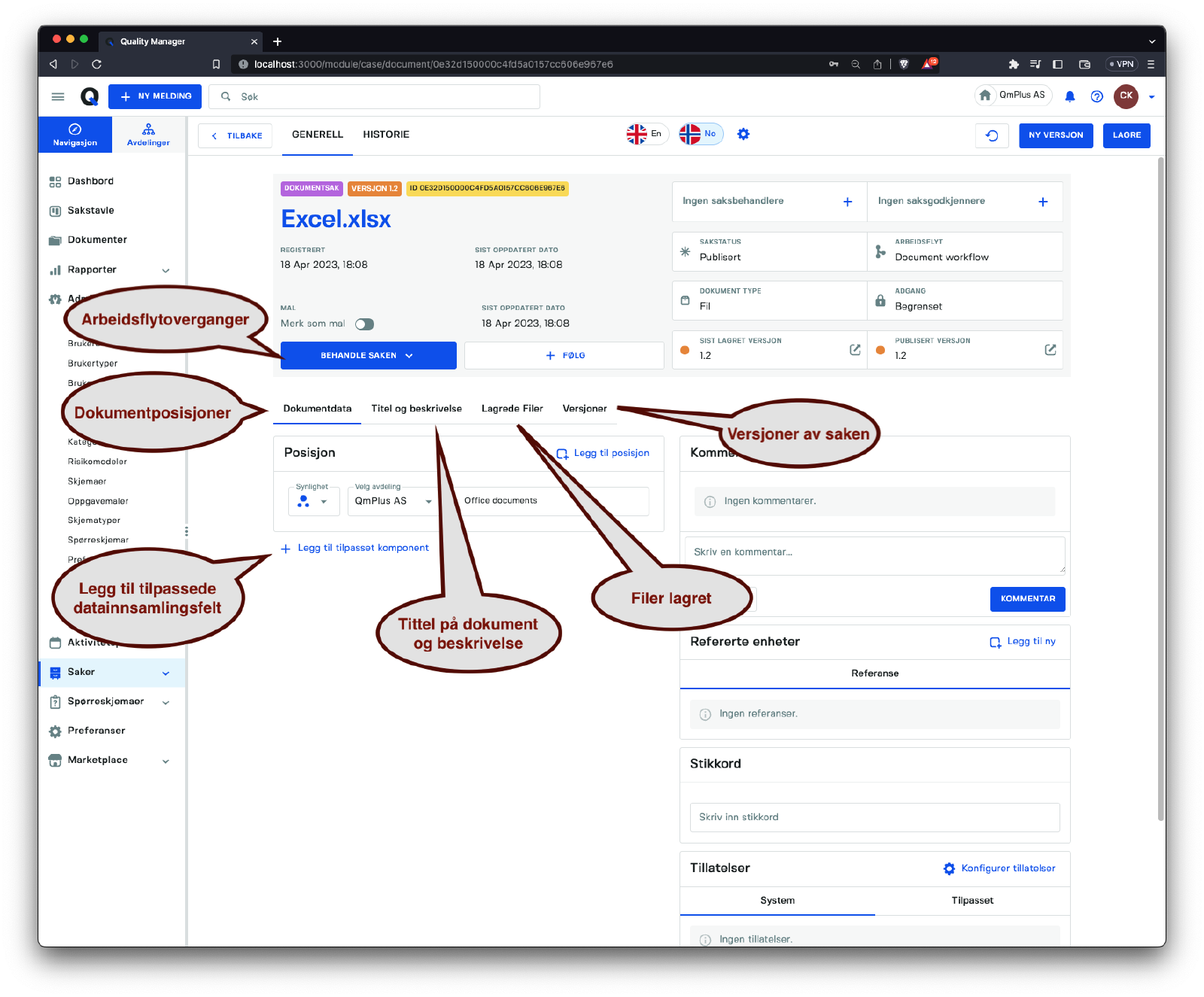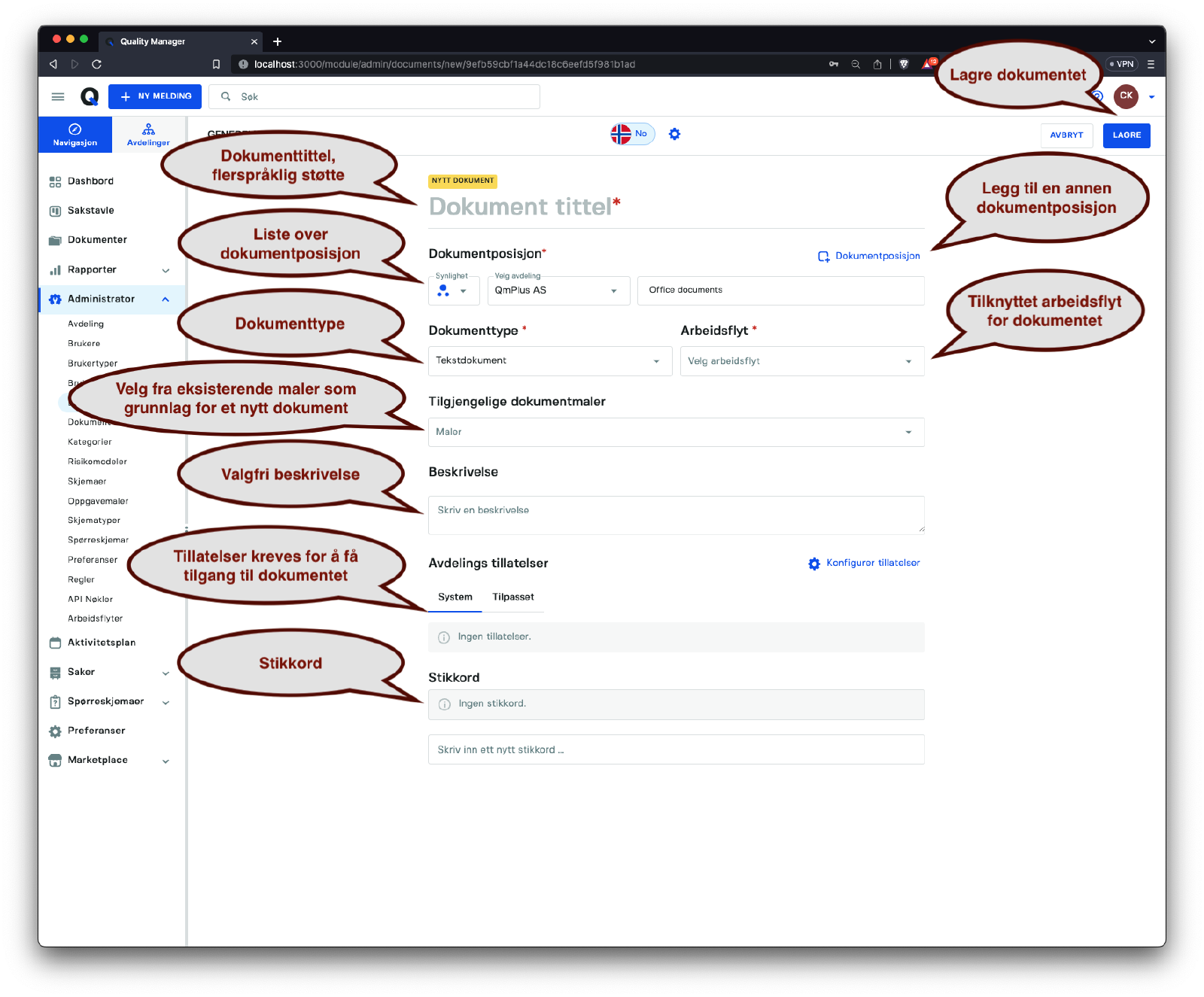 Dokumentbehandleren er det sentrale knutepunktet for dokumenthåndteringssystemet. Den lar deg organisere dokumenter, opprette nye, laste opp eksisterende, redigere dem eller deaktivere dem.