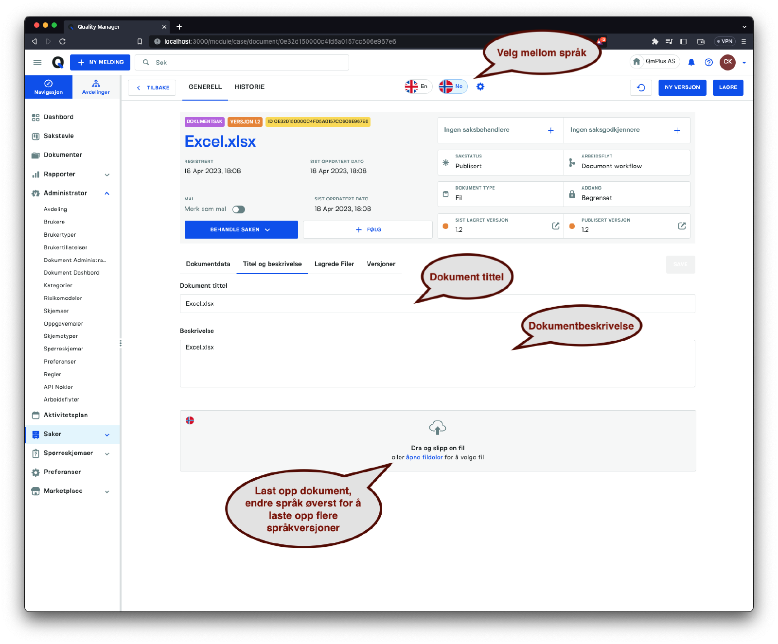Alle dokumenter på plattformen støtter flere språk, noe som gjør at du kan beholde alle språkversjoner av en prosedyre samlet i ett håndterlig tilfelle. For eksempel kan du ha en produksjonsprosess som må være tilgjengelig på både norsk og engelsk.