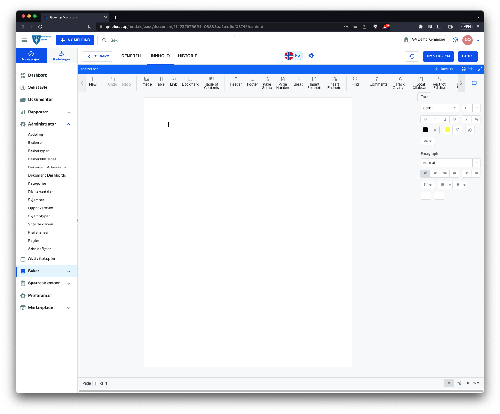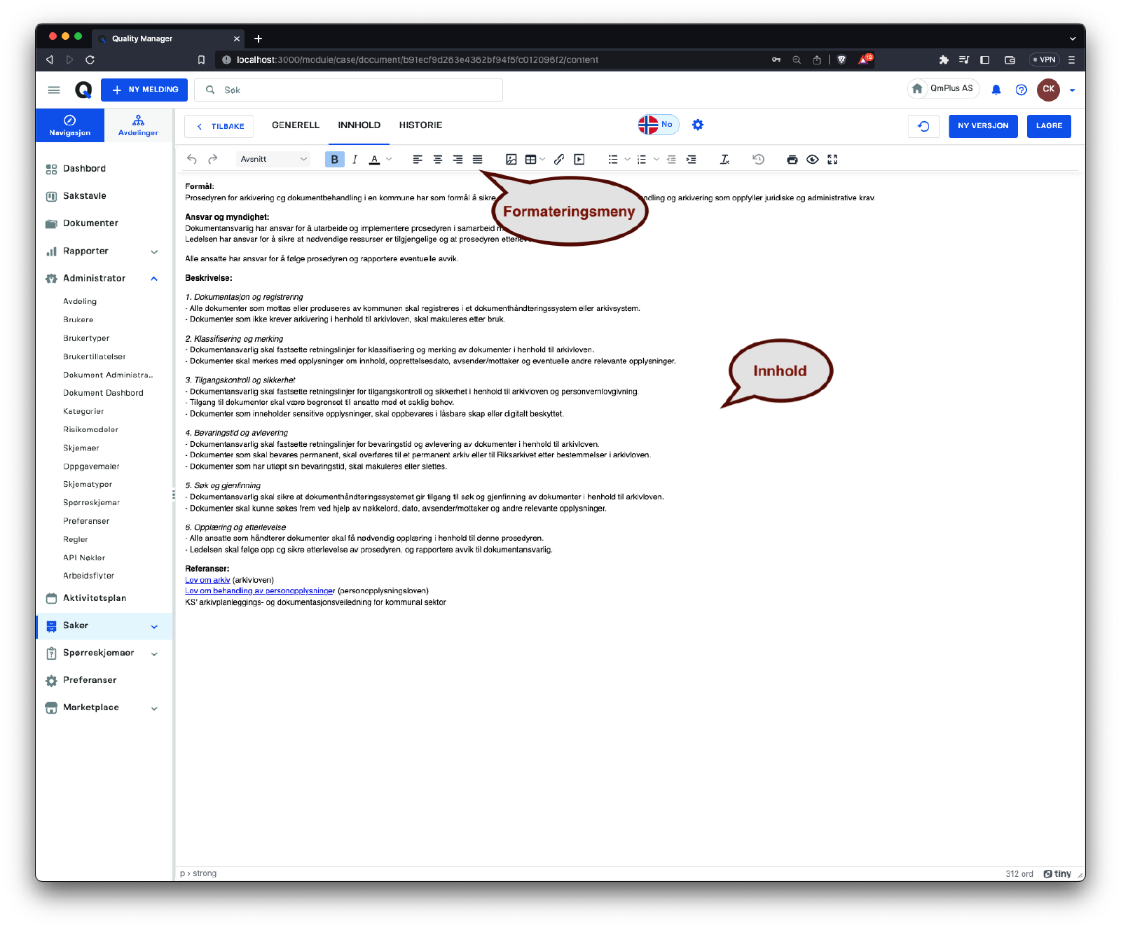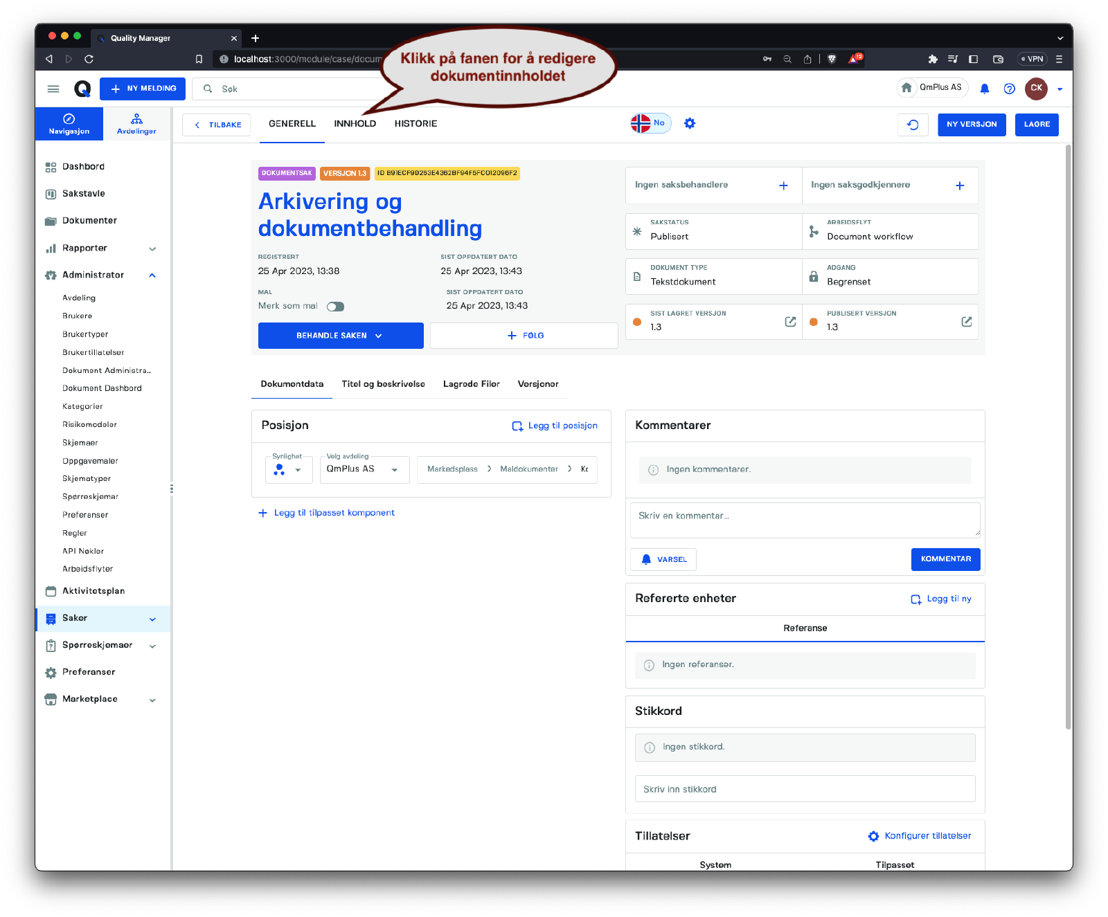 Tekstdokumentet har en Innhold-fane som lar deg redigere dokumentet.