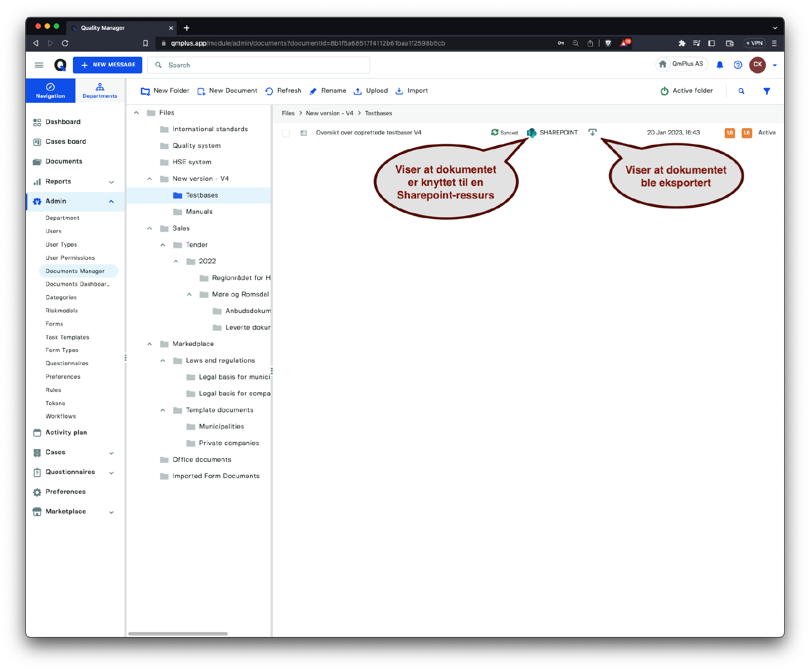 Når du har eksportert dokumentene, vil de være synlige i dokumentbehandleren med et SharePoint-symbol og et Eksport-symbol.
