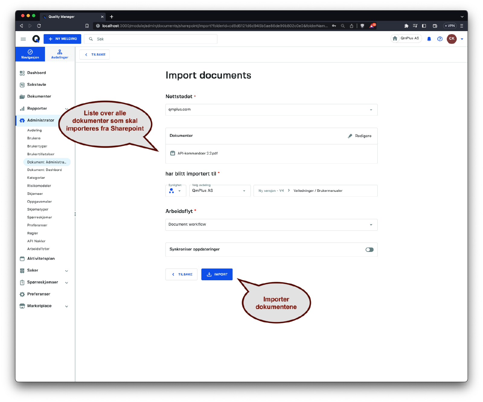 Når du importerer dokumenter fra SharePoint, må du fylle inn flere felter som beskrevet nedenfor: