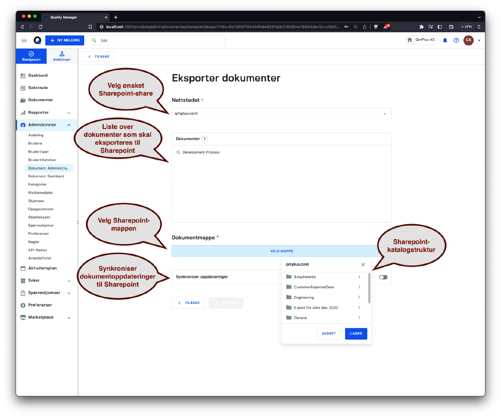 Dokumenter | Listen over dokumenter som eksporteres til SharePoint. |