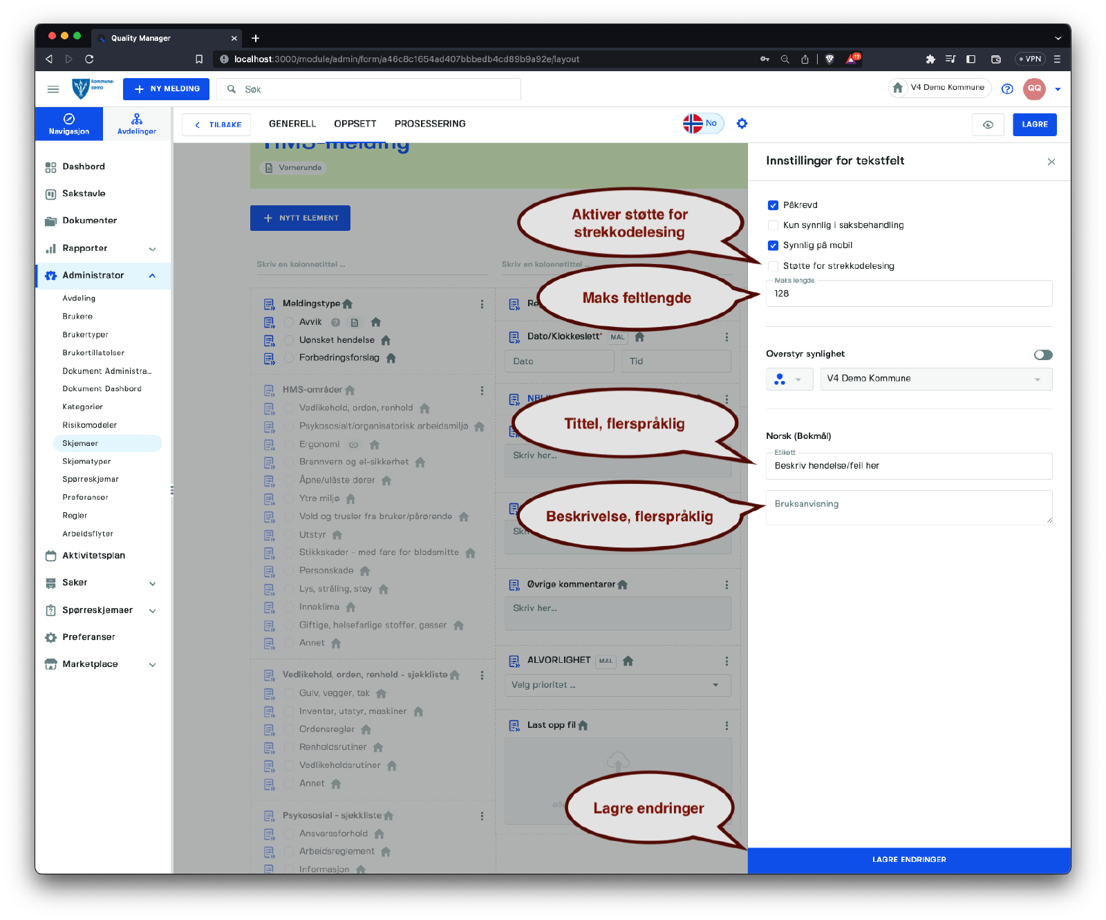 Beskrivelse | En lang tekstbeskrivelse for skjemaet, støtter flere språk. | |